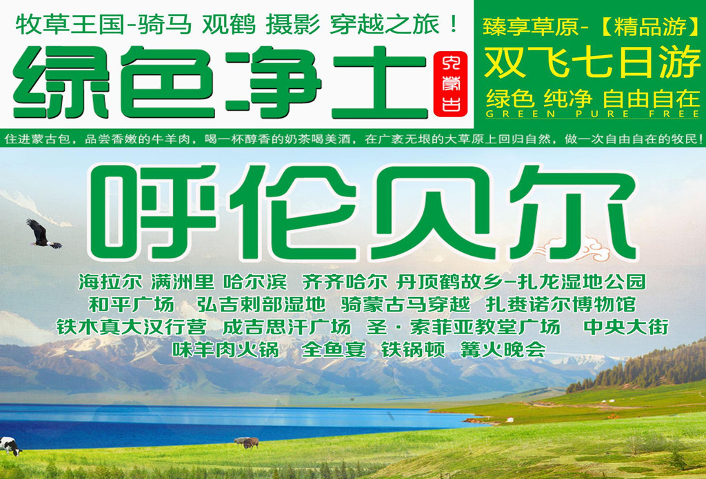 尊享呼伦贝尔亲子版双飞6日游 .成都直飞海拉尔 一价全含 0自费.360°航拍+赠送精剪视屏.穿蒙古袍,品奶茶,做地道蒙古人.高端酒店:1晚满洲里大饭店 2晚海拉尔预备五星 1晚特色木刻楞 1晚草原风情蒙古包.美食盛宴:至尊烤全羊、铁锅炖、百鸟归巢宴、地道东北菜、全鱼宴、俄罗斯西餐、手把肉、涮火锅.豪华赠送: 骑马漫游草原,激情滑草,访问俄罗斯后裔家庭,夜游满洲里,俄罗斯歌舞表演风味大餐,尊享