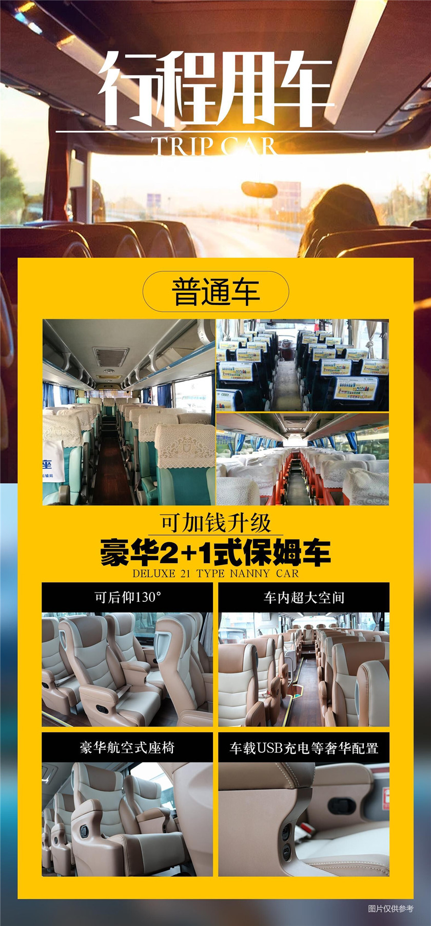【用餐】:全程3早6正,十人一桌,八菜一汤,不足十人,酌情减菜