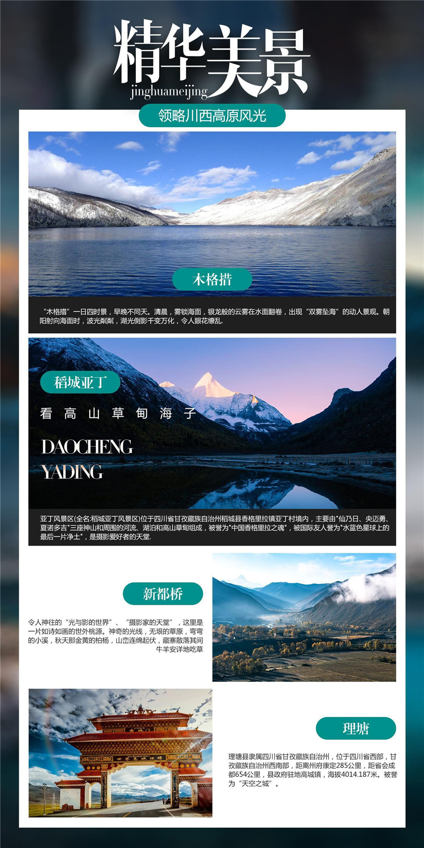成都出发经雅康高速公路从四川雅安再到甘孜泸定,雅康高速一路向西,穿越巍峨的二郎山,紧接着来到了大渡河经过【大渡河谷】前往情歌之城【康定】一览康巴文化,用完午餐后前往康定木格措景区,然后乘坐康定情歌【木格措景区】的观光车进入景区(观光车 90 元/人,必须消费,自理),景区由芳草坪、七色海、杜鹃峡、药池沸泉(药池泡脚 35 元/人,自愿自理)、木格措(野人海)和红海、黑海等景点组成;“木格措”一日四时景,早晚不同天。清晨,雾锁海面,银龙般的云雾在水面翻卷,出现“双雾坠海”的动人景观。朝阳射向海面时,波光粼粼,湖光倒影千变万化,令人眼花缭乱。午后微风拂面时,海面上“无风三尺浪,翻卷千堆雪”,站在海滨沙滩上,遥望雾霭烟笼的远方,犹如来到了天涯海角。夕阳西下,余辉洒满海面,流金溢彩,水天一色,群山沉寂,碧海静谧。不同的季节还可以观赏”卧虎观月”、石佛镇海”等山景外,在各个季节的不同时辰还可观赏到“双雾坠海”、“木格夕照”、“木格晨曦”、“木格潮汐”和迭瀑飞泉等云、霞、雾、水奇景,海滨珍珠沙滩可享沙浴、日光浴之乐,湖中可乘坐游船(游船往返 66 元/人,游客可以根据自身情况自费乘坐游览,游船运营时间:4-10 月份)。而后返回摄影天堂【新都桥】(新都桥镇在国道 318 川藏线南北岔路口,有一片如诗如画的世外桃源。神奇的光线,无垠的草原,弯弯的小溪,金黄的柏杨,连绵起伏的山峦,错落有致的藏寨,星星点点的牛羊……是令人神往的“光与影的世界”、“摄影家的天堂”)