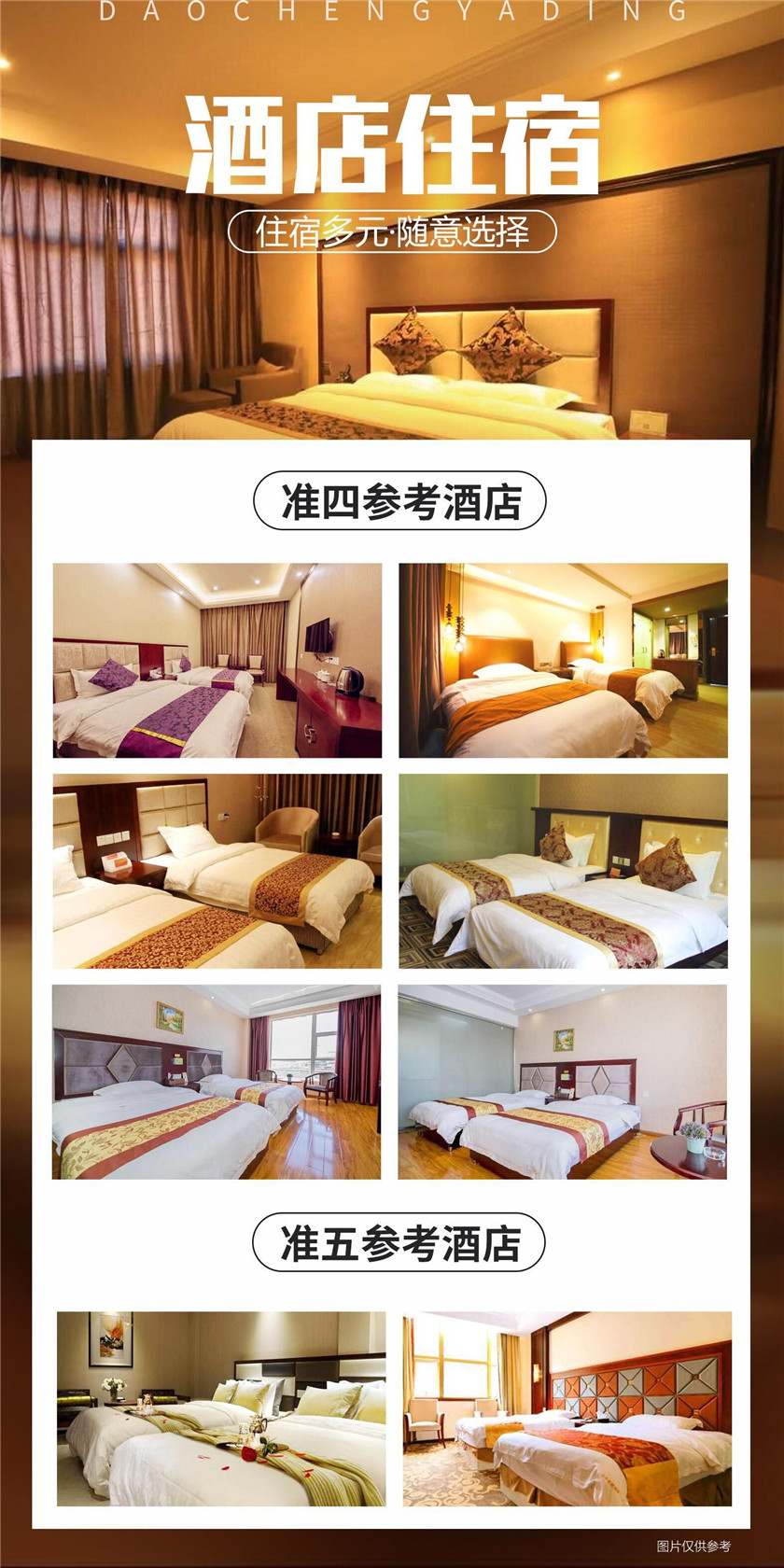 住宿:4晚指定标准酒店双标间,如产生单男单女,我社尽量拼房,若不能拼房,须由客人自行补单房差。用餐:全程含4早8正餐,十人一桌、八菜一汤。(亚丁景区午餐客人请自备干粮)