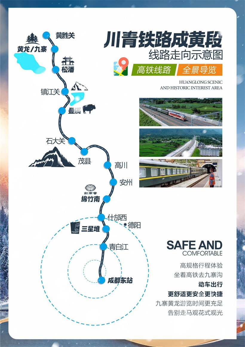 早上自行前往东站乘坐高铁—开启梦幻的高铁九寨黄龙之旅,途径青白江/三星堆/什 邡西/绵竹南/ 安州/高川/茂县/镇江关/松潘/川主寺/黄胜关 10 个站。 接站举客人名 字。 专车前往游览黄龙景 区, 游览景区的数千个钙化彩池形态各异,流光泛彩,长 达 2500 米的钙化硫是世界之最。沿途 主要景点有【洗身洞、金沙铺地、盆景池、黄 龙洞、黄龙寺、石塔镇海、五彩池】等。黄龙游览时 间 3.小时左右,黄龙景区后,专 车送到酒店住宿,晚上自由活动。