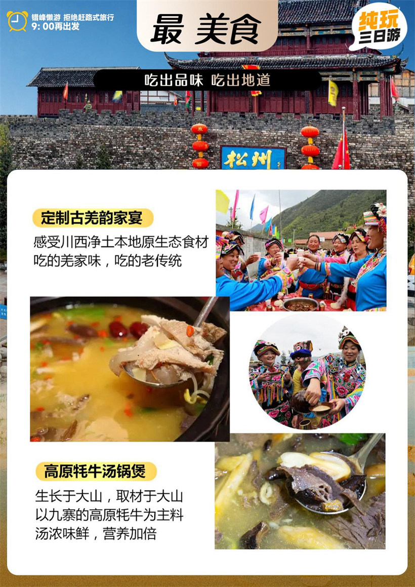 自行前往统一地点集合(因为旺季来临,九黄线堵车,懒人行程从 2022年7月5号开始提前到 9:00)出发,乘坐旅游车途 经都江堰,都汶高速沿紫平铺库区而上,前往茂县。沿途观赏岷江河谷风光、藏羌民族风情,途中午餐享用特色中餐—羌家 福。