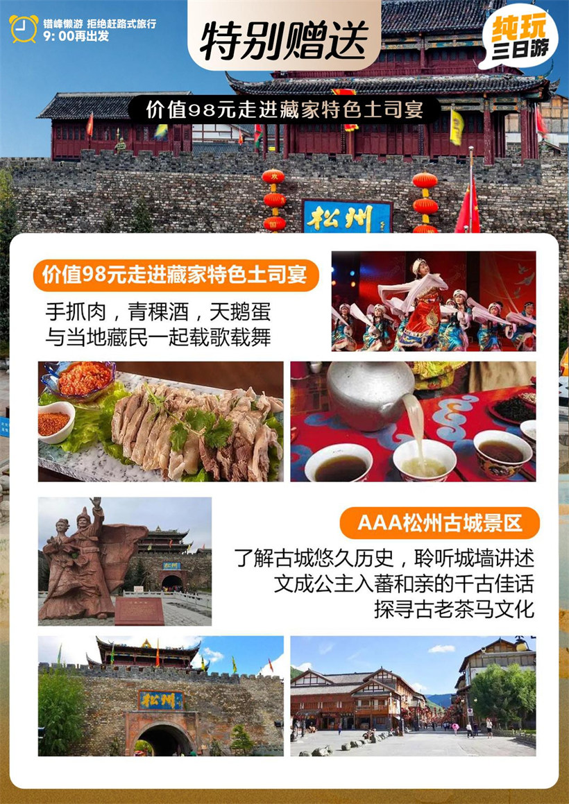 下午翻越1933年地震遗迹【叠溪海子】,叠溪海子实际上就是岷江主流的一段,是地震形成的堰塞湖。湖面宽只有大约 1 公里,但是长却有 10 公里之多,海子由上下两处接连而成,形如肠状,可拍照留恋(约 15 分钟)。游览完后继续乘车前往 【松州古城】(游览时间 20 分钟左右,不含上城墙费用)松州城是历代兵家必争的边陲军事重镇,是汉民族与少数民族 茶马互市的商贸集散地,是我国现存城樯中首屈一指的古城遗址。在漫长的历史风雨中,这里的藏、羌、回、汉民族与古城 一道历经了无数的战乱兴裒,古城记载和显示着风云变幻的沧桑和深沉豪迈的民族风格。