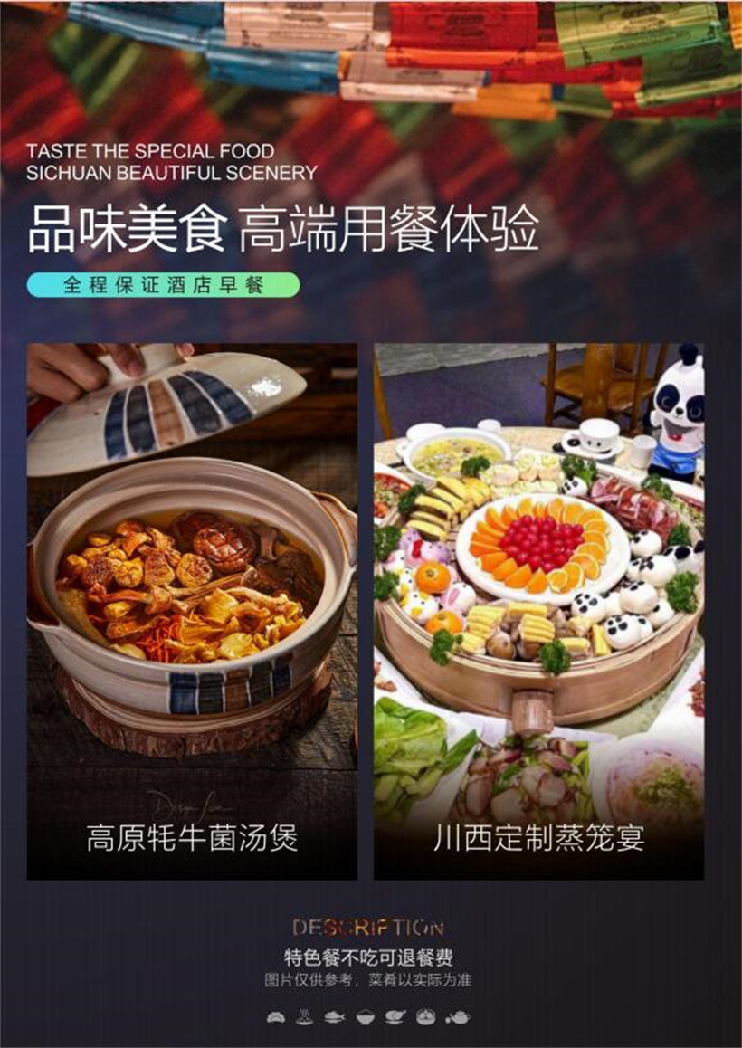 午餐川主寺品尝风味特色餐—牦牛药膳煲,午餐后继续乘车途径都江堰返回成都,结束愉快美妙的九寨仙境之旅。