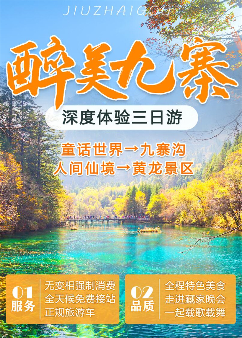 早晨06:30从成都出发,沿途观赏成都平原风光;经都江堰市,映秀、汶川,茂县。此路段为5.12地震灾区,可了解地震知识、感受灾后重建的新貌,观赏岷江河谷风光及藏羌民族风情。中午在川主寺享用午餐。午餐后乘车前往“人间瑶池”【黄龙风景区】(黄龙索道上行80元/人,下行40元/人,自理。)。黄龙以其雄、峻、奇、野风景特色,享有“世界奇观”、“人间瑶池”的美誉。迎宾彩池、飞瀑流辉、金沙铺底地、争艳池、明镜倒影、梭罗映彩、黄龙寺、五彩池等,彩池规模不同,形状各异,有些池水映出各种不同的色彩,五光十色,争奇斗妍;浅滩上水流涌动,阳光照射,波光粼粼,晶莹透亮;水下铺垫着一层细细的浅黄色苔藓,涉足滩流,倍感柔软清凉,此时此地,恍若进入瑶池仙境。黄龙景区海拔较高请量力而行,也可自费乘索道赴五彩池,沿途欣赏迎宾池、飞瀑流辉、洗身洞、盆景池等,游览结束乘车前往九寨入住酒店