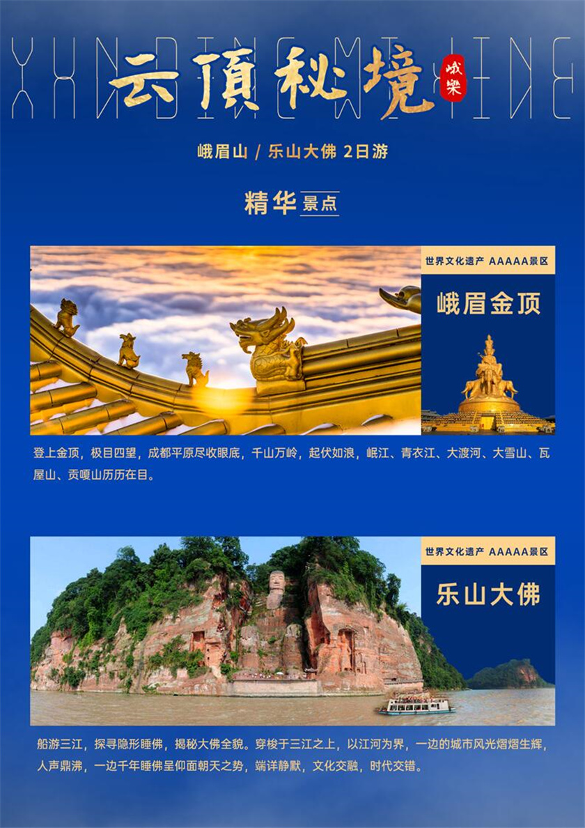 门票:含峨眉山景区首道大门票(旅行社团体票)、乐山游船票、报国寺门票,特价产品,优免不退。