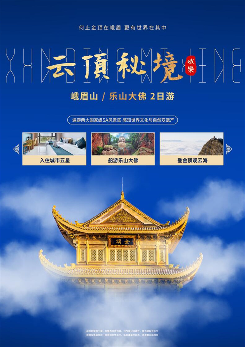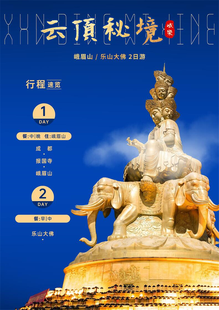 2.午餐后前往峨眉主峰【金顶】游玩,金顶位于峨眉山上,周边都是寺庙和景点,名胜云集,为峨眉精华所在。在金顶上,朝拜高48米的十方四面普贤菩萨金像,是众多游客来到峨眉山的重要原因;