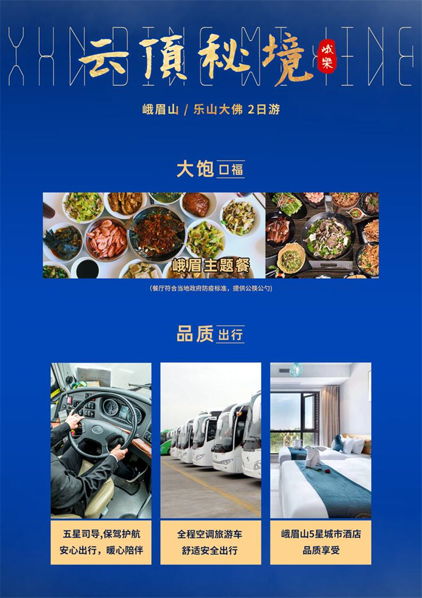 住宿:入住指定峨眉山城市五星酒店(参考酒店:漫雅,乐达,卷舒堂,苹果居或同级)。