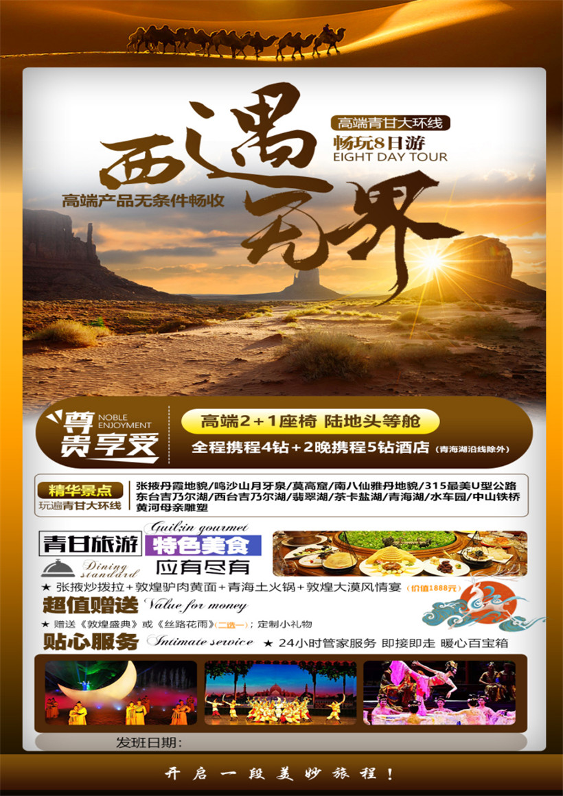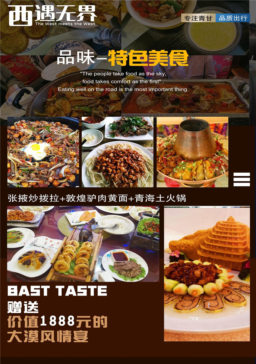 早餐后继续乘车前往国家历史文化名城,丝路明珠敦煌市。途中欣赏戈壁沙漠公路,感受西北的苍凉,辽阔。后乘车前往参观游览【莫高窟B类票】(含摆渡车,游览时长约3小时)它是致敬信仰的力量一种独特的艺术成就,也一种创造性的天才杰作。莫高窟由数百个不同功能的石窟组成庞大的石窟群及其戈壁沙漠中的绿洲环境是中国石窟建筑的杰出范例。面对绚丽多彩的敦煌壁画,情不自禁会被它的多样性的形式和丰富性的画面深深吸引,同时还会对以前的民间艺术家与工匠的创造性而为之感慨。在它的艺术创作中,最吸引人的就是它的色彩。敦煌莫高窟壁画历史与现状,带着犹如朝圣般的心情,我们爬上长长的栈道,在手电筒微弱的光线中,莫高窟1200多年积蓄的宝藏一一呈现在眼前。后乘车前往【鸣沙山月牙泉】(游览时长约2.5小时)月牙泉处于鸣沙山环抱之中,其形酷似一弯新月而得名。数千年来沙山环泉,泉映沙山,在沙山深谷中,“风夹沙而飞响,泉映月而无尘”。月牙泉有四奇:月牙之形千古如旧、恶境之地清流成泉、沙山之中不淹于沙、古潭老鱼食之不老。月牙泉有三宝:铁背鱼、五色沙、七星草,传说铁背鱼和七星草一起吃可以长生不老!游览结束后享用晚餐我社特别赠送【敦煌风情宴】莫高窟里面有45000平--方的米的壁画,有很多就是关于饮食的,在结和我们当地的物产,所以就有了大漠风情宴,大漠风情宴主要是有八道大菜组成:1、雪山驼掌 2、油爆驼峰 3、驴肉黄面 4、大漠风沙鸡 5、火烧羊排 6、清蒸红鳟鱼 7、风味牛肉 8、鸣山大枣(另外还有八个当地的时令凉菜,别外还有二个热菜)上到18个菜 要“发”的意思。