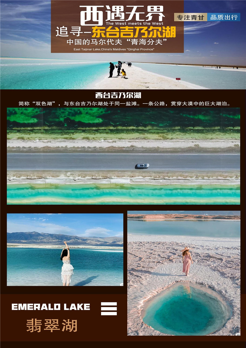 早餐后乘车,继续沿着G315西行,一路上大西北风光尽收眼底。沿途车观【南八仙雅丹】据说是为了纪念八位在这里进行科研考察时殉职的女地质学家。时光流转,人生倥偬,白云沧苟之间再觅不得她们的丝毫痕迹。只见无尽无垠如迷宫般的雅丹,冠以她们的名字在劲风流云之间,屹立着,变幻着;消逝着、新生着。一路飞驰在去往魔鬼城南八仙的无人公路上,前面是大片大片低飞的云朵,荒凉苍茫的的戈壁从车窗外飞掠着,一闪而过,一路上的戈壁被大大小小的长条形土墩和馒头一样的土丘所取代,大自然的风长年累月的拂过这片土地,留下形形色色怪异诡谲的纹路。后乘车前往游览【东台吉乃尔湖】(游览时长约1小时)它是柴达木盆地中一颗碧蓝的眼睛,清澈的水域凉爽透亮,看到它,能让人瞬间感受到如冰镇饮料般的凉爽。就算你不旅游,也一定知道马尔代夫,这里是世界上最美丽的地方之一,在绿松石色的海水和洁白的沙滩的衬托下,成就了马尔代夫作为“最美水色”的形容词。一道梦幻长堤从湖心穿过,这里有着丝毫不逊于马尔代夫的浪漫。而东台吉乃尔湖所处高原无尽的自然风光和丰富体验,却是马尔代夫又比不了的。 游览【西台吉乃尔湖】(游览时长约0.5小时)被 G315国道从湖中穿过,将湖面劈为两半,左右泾渭分明,两边湖水一半蓝,一半绿完全不一样,奇特而漂亮!双色湖,看起来,和大海的颜色是一样的,如果我不告诉你在青海,单看照片,你肯定认为这是在海边拍的。晚入住大柴旦县酒店