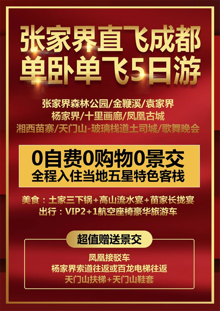 中餐后乘车前往游览【土司城】,土司城内神土家历史文物展示、土家民俗演示、"九重天" 、"千人毛古斯"两项世界吉尼斯之最,土家园林艺术等丰富多彩。在这里可以让您充分领略到土家族山寨风貌和精彩的土家族民俗风情(景区内有陈列馆,展示馆,非团队旅游购物店)适时张家界荷花机场搭乘CA4378(18:20-19:15)返回成都温馨的家