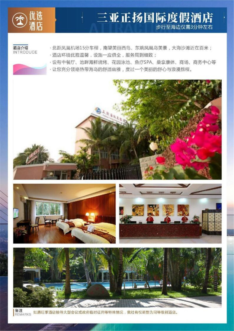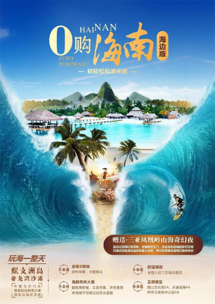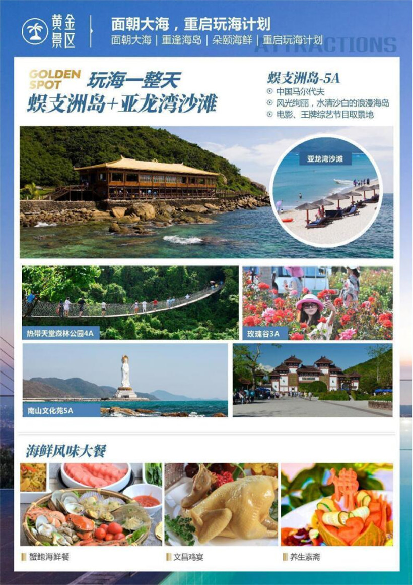 行程所含景点:如遇不可抗力因素无法安排的退费标准:蜈支洲岛120元、玫瑰谷5元、天堂森林公园50元、南山佛教文化苑80元、大小洞20元;帆船航海因天气原因不能出海更改为等值夜游三亚湾或者骏达车技表演