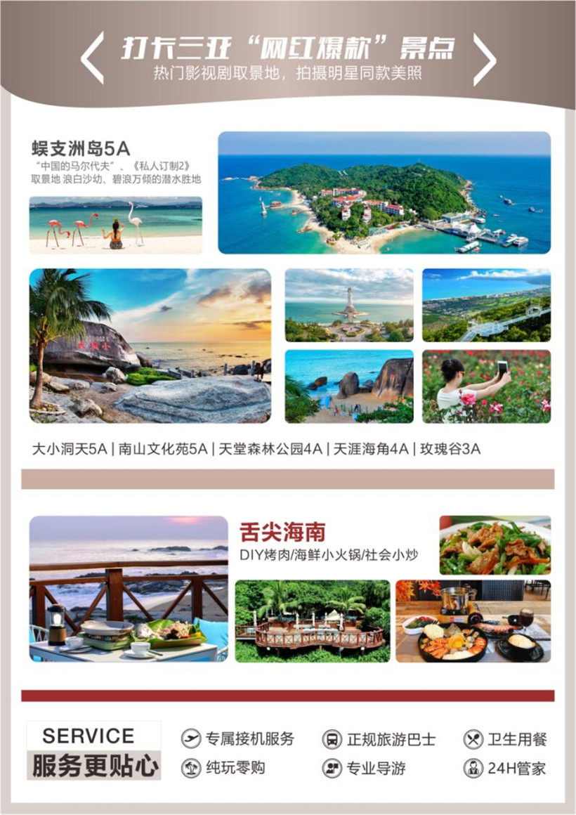 ◎洁白无暇的沙滩,清澈见底的海水,随风摆动的椰林,难道这是天堂的景色吗?其实,这是位于三亚海棠湾,有“中国马尔代夫”之称的蜈支洲岛。【游览不少于300分钟(含上下岛时间)】,岛上保留了更多自然淳朴的气息,宛如一片远离尘世的世外桃源,一揽清澈的海水、海岸线蜿蜒绵长、观赏绮丽的自然景色,这里由沙滩、阳光、碧水,绿荫构成一幅美丽的滨海风光图册,随手一拍都是无需滤镜的天然美照,朋友圈刷赞利器。最适合想要放松身心,享受宁静假期的你。