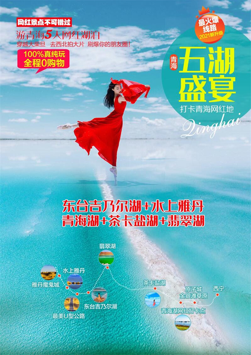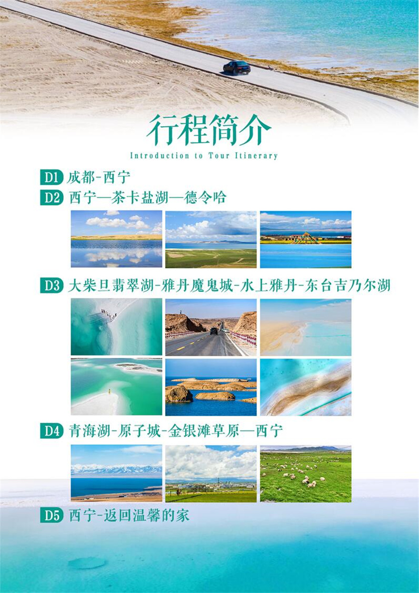 前往最新发现最火爆景点【东台吉乃尔湖】游玩指南:中国的马尔代夫不在海南,也不在西沙群岛,而是在青海的东台吉乃尔湖! 最美的青海版马尔代夫,有此湖,不用去马尔代夫就能拍过绝美的蓝天海边大片。游玩时间:约1小时门票价格:免费特别备注:高原地区,紫外线强,做好防晒,太阳镜,遮阳帽,遮阳伞【水上雅丹】游玩指南:乌素特雅丹地质公园位于青海柴达木盆地的西北部,历经千万年的地质运动和时空苍变,孕育和形成一片世界面积最大、最为壮观的雅丹群落,面积约2.1万平方公里,主要分布在南八仙、俄博梁地区,是发现的世界上最早的一处水上雅丹景观。游玩时间:约2小时门票价格:¥60(含门票,不含观光车及景区内其他娱乐性消费项目需另付费(自愿购买原则))17:30返回德令哈或大柴旦或者格尔木(按实际情况选择)历程300公里,历时约 4小时【含青海湖网红打卡点】游玩指南:青海湖是中国最大的内陆湖,湖水蔚蓝清澈,远远望去就有蓝色的大海出现在眼前,而旁边的油菜花,薰衣草花海,空中的海鸥,石子铺满的湖边更是美不胜收,这里被称为“青海湖边最美网红打卡地”,可以直接到青海湖湖边!