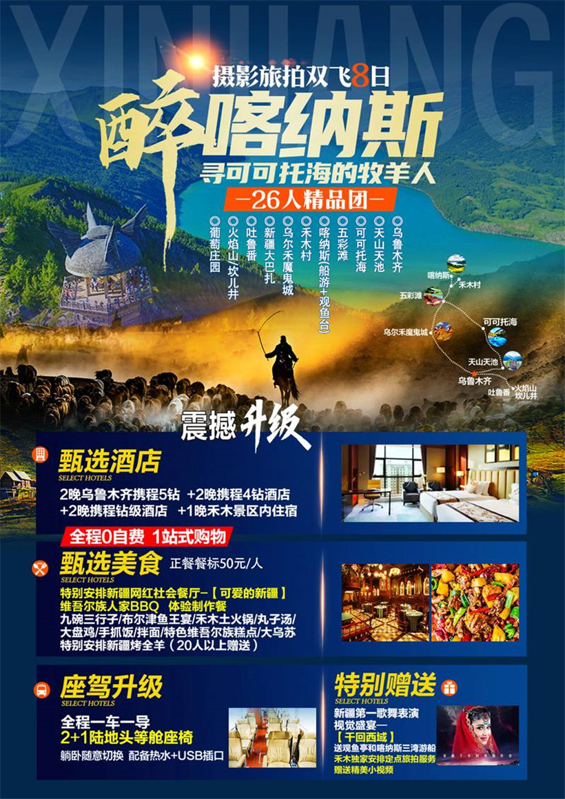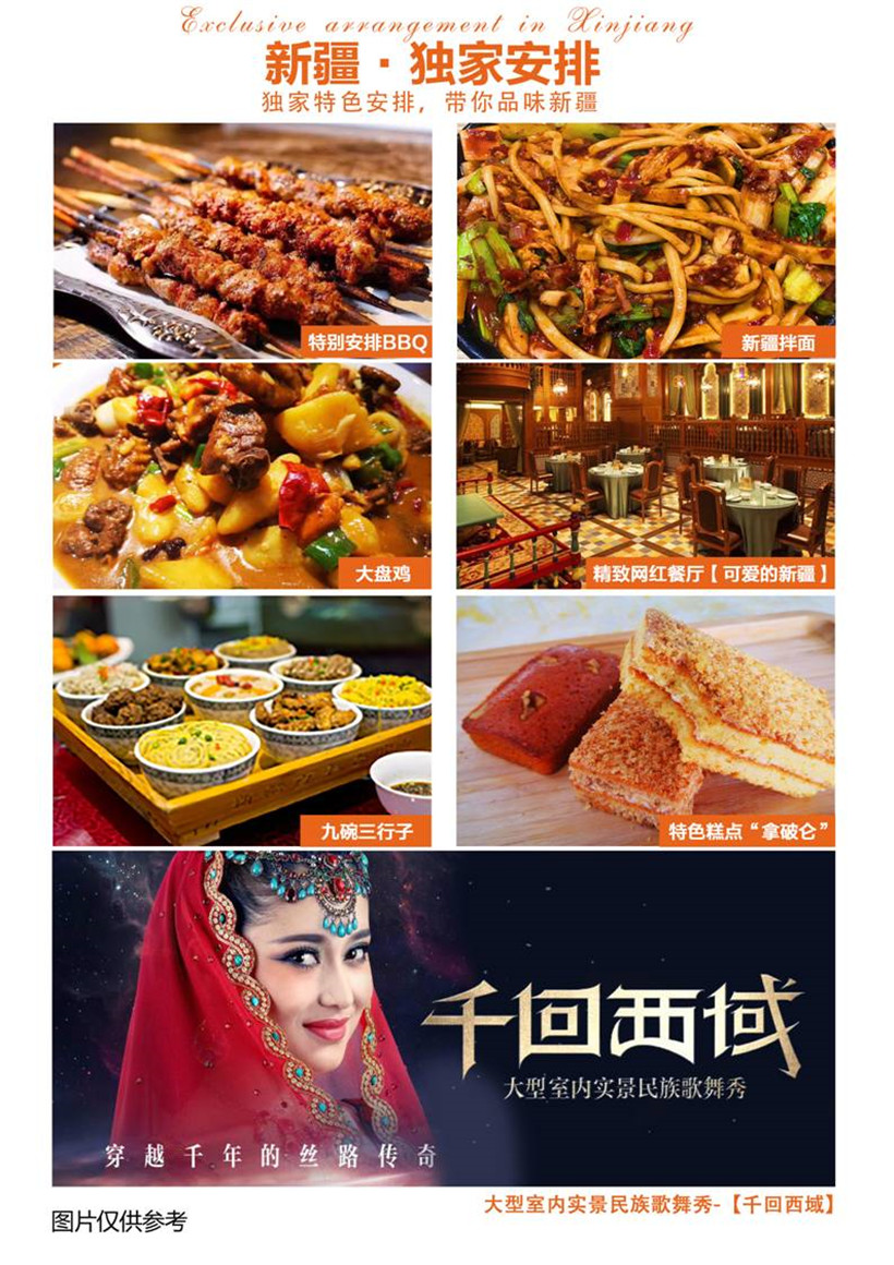早晨从克拉玛依出发,前往【新疆大巴扎】,是新疆商业与旅游繁荣的象征,也是乌鲁木齐作为少数民族城市的景观建筑,又是一座标志性建筑。国际大巴扎具有浓郁的伊斯兰建筑风格,在涵盖了建筑的功能性和时代感的基础上,重现了古丝绸之路的繁华,集中体现了浓郁西域民族特色和地域文化。后前往新疆大剧院,观看大型室内实景民族歌舞秀【千回西域】,【新疆大剧院】大型室内实景民族歌舞秀《千回西域》做为新疆的名片,给来自全国乃至世界各地慕名前来观看的观众留下了精彩绝伦的西域第一印象。众多媒体报道:到了新疆,如果没有观看到新疆大剧院的《千回西域》,便是错失了一次真正领略 大美新疆西域舞蹈精髓。这是目前为止全国最高的穹顶类剧院建筑,这是一场融合多民族歌舞,贯通古今丝路文脉的歌舞秀,以西域的灿烂文化、历史故事为基点,将民族歌舞、杂技与现代化声光电等舞台艺术完美结合,呈现给观众“一幕纵千里,一秀观千年”的视觉盛宴