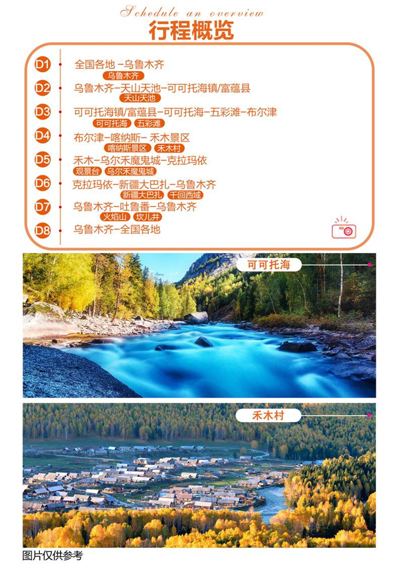 早晨前往【可可托海】(已含门票及区间车),可可托海不是海,是额尔齐斯河峡谷美丽的丛林,哈萨克语的意思为"绿色的丛林",蒙古语,意为"蓝色的河湾"。可可托海神钟山景区里面奇峰怪林无数,瀑布飞流直下三千尺,温泉水滑洗凝脂……然而最不容错过的是那一个个与爱情有关的元素。进入景区,你会发现自己完全置身在白桦林的海洋。白桦林游览区素以“浪漫情人岛”著称,树林内小桥流水,树影婆娑,形态万千。夏天的白桦给人清新的凉爽,如果是秋天,那就是醉人的金黄。中餐后前往边城童话小镇布尔津,约下午时分抵达五彩滩,【五彩滩】(已含门票)这里是额尔齐斯河的一段特殊的河滩,南岸是葱郁的树木和草地,北岸则是寸草不生的土地,一河两岸,各有洞天。这里的土丘拥有丰富的地貌色彩,被称为上帝打翻的调色板,尤其是天气晴好夕阳西下时分,进入景区后看到余晖洒在河岸边的丘陵,颜色瑰丽令人炫目。穿行在土地的沟壑之中,两侧的土壤或呈灰褐色,或呈金黄色,还可以登上观景台,俯瞰整个景区带给眼睛的色彩冲击,举起相机拍出你想要的大片。结束后返回布尔津入住酒店