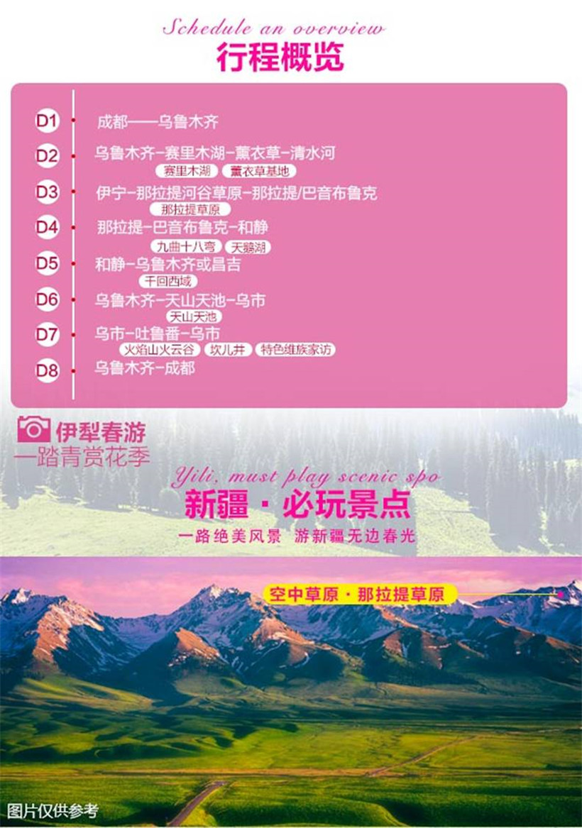 【包含景点】天山天池门票及区间车、吐鲁番坎儿井门票、火焰山门票、东西喀拉峻门票+区间车、那拉提门票+区间车、赛里木湖门票+区间车、巴音布鲁克草原门票+区间车。