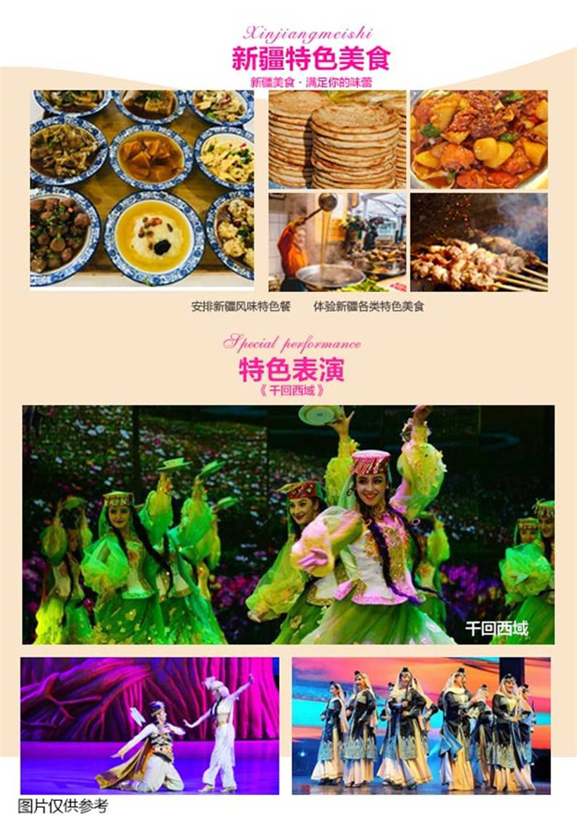早乘车赴乌鲁木齐,前往新疆大剧院,观看大型室内实景民族歌舞秀【千回西域】,【新疆大剧院】大型室内实景民族歌舞秀《千回西域》做为新疆的名片,给来自全国乃至世界各地慕名前来观看的观众留下了精彩绝伦的西域第一印象。众多媒体报道:到了新疆,如果没有观看到新疆大剧院的《千回西域》,便是错失了一次真正领略 大美新疆西域舞蹈精髓。这是目前为止全国最高的穹顶类剧院建筑,这是一场融合多民族歌舞,贯通古今丝路文脉的歌舞秀,以西域的灿烂文化、历史故事为基点,将民族歌舞、杂技与现代化声光电等舞台艺术完美结合,呈现给观众“一幕纵千里,一秀观千年”的视觉盛宴。后入住酒店休息