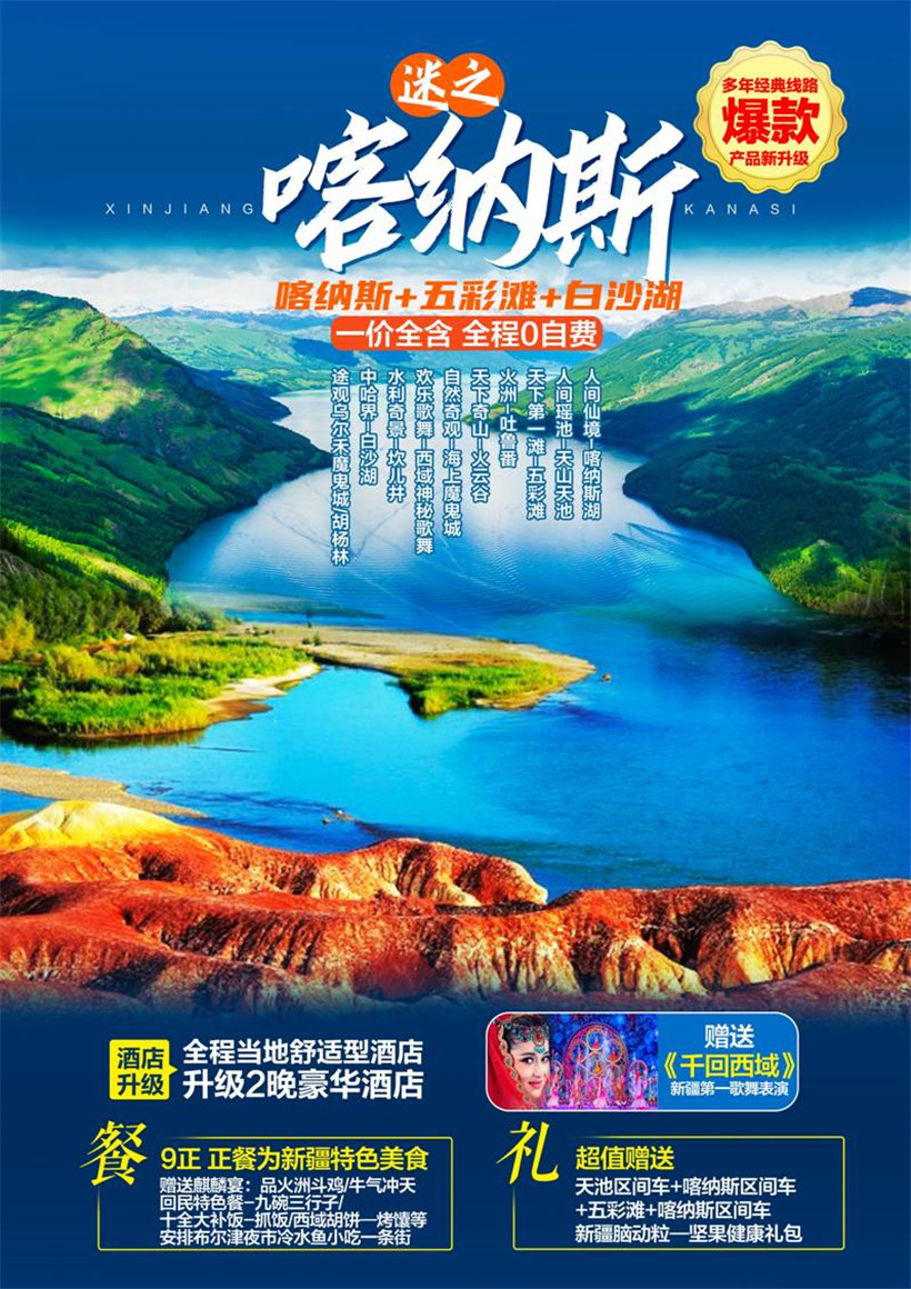 早餐后乘车赴“东方瑞士”喀纳斯湖【含首道门票】 【含一进区间车】,途经阿勒泰大草原;抵贾登峪乘观光车,进喀纳斯湖,途中欣赏神秘静谧【卧龙湾】、【神仙湾】【月亮湾】【鸭泽湖】等。抵达湖区后漫步湖边,欣赏绿坡墨林、艳花彩蝶的湖光山色。晴朗的天空,壮观的冰川映衬着宁静的湖水、茫茫的草原包容着幽深的原始森林、美丽神秘的喀纳斯湖,在新疆感受到“大海”的辽阔,传说在喀纳斯湖有“水怪”出没,给它披上了神秘的面纱。嫩绿的草原以及图瓦人星星点点的小木屋,美轮美,堪称仙境,晚入住贾登峪; 此时做您自已最喜欢的事情,放飞一下自由的身心