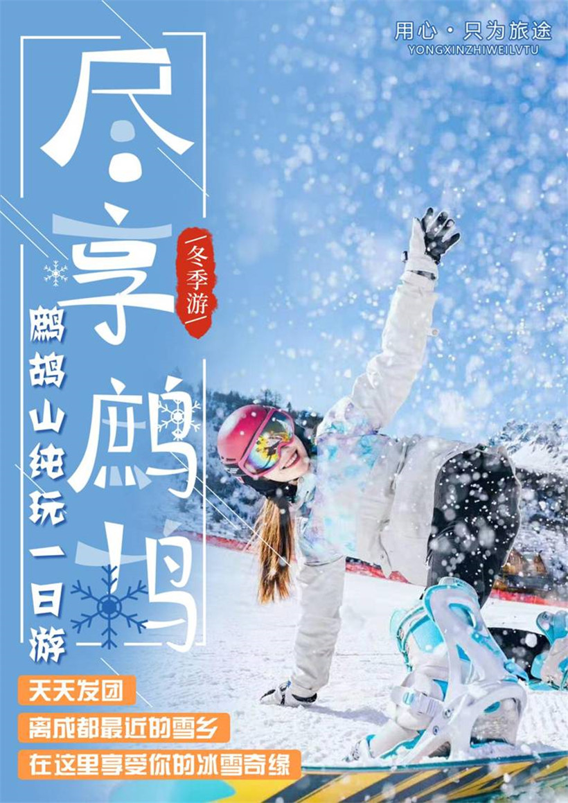 早上在市区指定地点统一集合(具体出发时间以导游通知为准)沿岷江风光而上,途经都江堰、紫坪埔水利工程,抵达早餐后乘车前往滑雪胜地—鹧鸪山景区(观光车40自理,含滑雪1小时,自理超时费用每10分钟10元)。鹧鸪山自然公园打造的国内最大的滑雪、戏雪胜地—鹧鸪山冰雪世界,景区内有初级滑雪道一条,全长1000米,练习道150米,适合初级者练习,单板道一条,全长240米,另有戏雪区开放雪地迷宫,雪地摩托等18项雪上娱乐项目,游客可根据自己爱好自由选择娱乐项目。有趣好玩的雪上娱乐项目尽情玩耍,(为保证充足的景区游览时间,我社不安排午餐,请自备食物或自行在景区用快餐,快餐38元/人,自理)下午返回成都,结束愉快旅程!