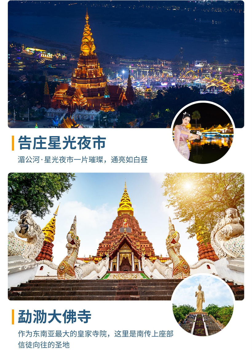 享受自由活动半天(自由活动时间以导游根据实际情况安排为准); 前往【勐泐文化园】车程约 30 分钟左右(游览时间约 120 分钟左右,不含电瓶车费用 40 元/人自理);佛 寺是在古代傣王朝的皇家寺院“景飘佛寺”的原址上恢复重建的,“景飘佛寺”是傣族历史上一位傣王为纪念病故 的王妃而修建,在这里欣赏美丽的傣族信仰小乘佛教的历史文化,参加【天天欢度泼水节】,场面壮观,亲自感受 泼水节的欢乐与热情。 【告庄西双景】为傣语,汉意为“九塔十二寨”,旨在重现古时景洪盛景,打造一个繁华昌盛的“景洪 城中 之城”。根植于西双版纳傣族文化,融合大金三角、湄公河流域傣泰文化精华,引进现代前沿思想, 缔造前所未有 的大金三角傣泰文明之心。【大金塔】高度是 66.6 米,寓意一江连六国,又被称为缅甸大金 塔,是告庄西双景的 九塔之一。大金塔本身是以塔林的方式建造的,在主塔旁边有 4 座小的实心佛塔。在 这 4 座小的佛塔四周,四周 都有一只人面灵兽。四个门中间还供奉了不大相同的人物,每尊神前都会设蒲 团,供给供奉者。 【星光夜市】夜市的食物价廉物 美,直到深夜食客还是摩肩接踵络绎不绝,凌晨两三点都不一定打得了烊收 得了摊。 【六国水上市场】是国内首例唯一一个具有东南亚风情的水上市场,让中国人不出国门,也能在告庄体 验 到真正的六国风情。 晚上 21:30 统一指定集合地点,师傅送回酒店,如没按约定时间,客人自理回酒店