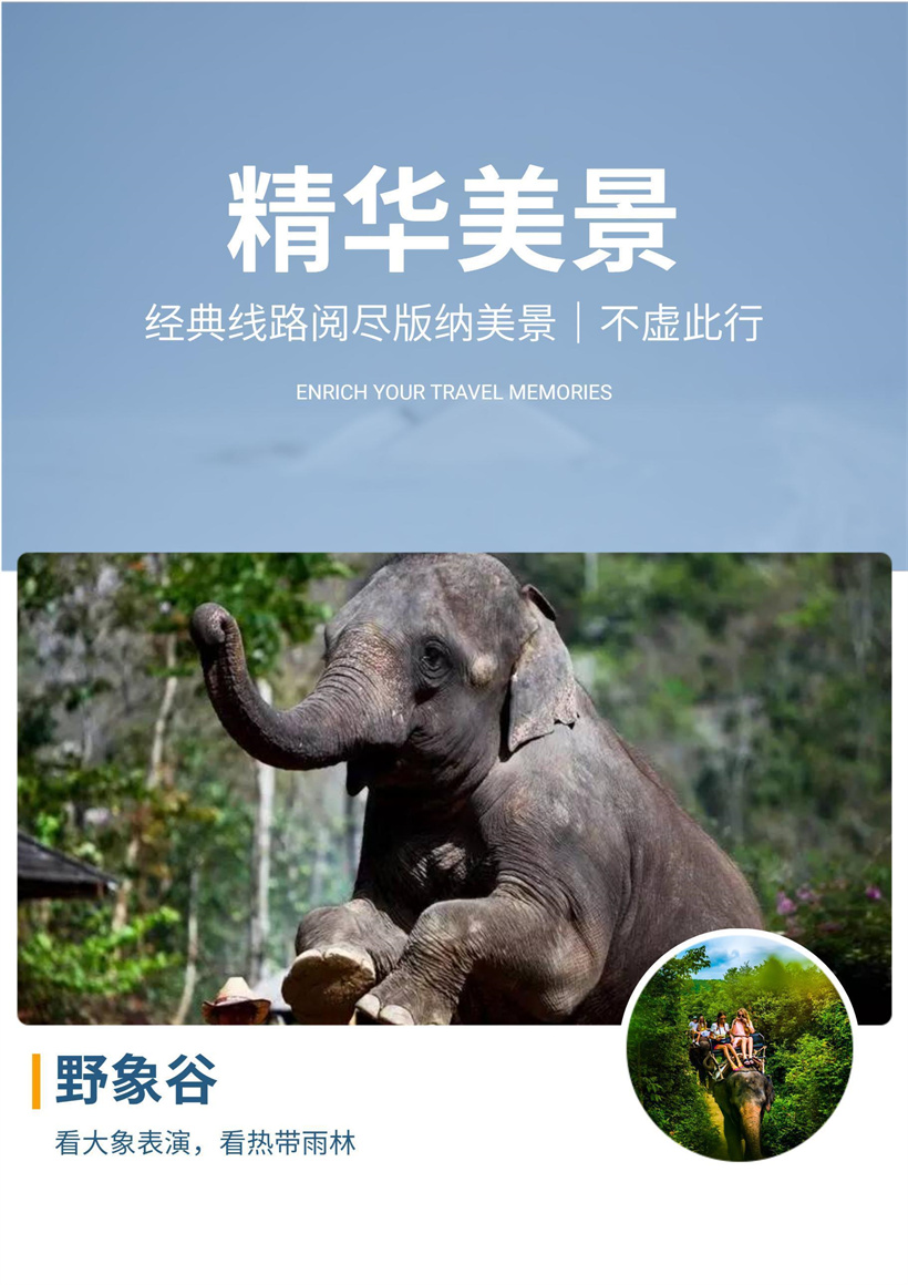 早餐后前往亚洲象的聚集地以及国家 AAAA 级景区【野象谷】 车程约 40 分钟左右,(游览时间约 90 分钟, 不含索道),无数棵百米高的望天树在这片沟壑纵横的热带雨林中错落而生,将这里搭建成一座天然的绿色城堡, 百鸟清脆的争鸣声宛如一曲曲动听的歌,迎接着远道而来贵宾。我们特意为您安排了大象表演,让您与乖巧、聪明 的大象零距离接触。观看全国唯一训象学校的【大象表演】,与大象亲密接触,游览【兰花园】、【蝴蝶馆】、 【蟒蛇园】、【蜥蜴园】。 中餐品尝象餐(60 分钟左右); 午餐后前往【曼听公园】车程约 30 分钟左右(游览时间约 120 分钟左右,此景区步行游览);是傣王御花 园,已有 1300 多年的历史。景区集中体现了"傣王室文化、佛教文化、傣民俗文化"三大主题特色