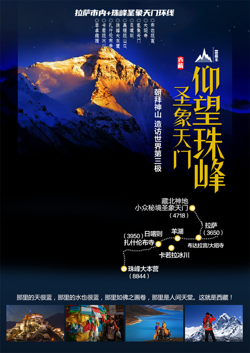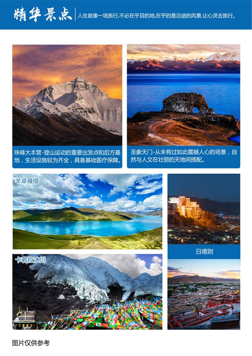 【卡若拉冰川】是西藏三大大陆型冰川之一,为年楚河东部源头。巨大的冰川从山顶云雾飘缈处,一直延伸到离公路只有几百米的路边,晶莹幽蓝中,捎来几许凉嗖嗖的感觉。虽然由于长年受公路上灰尘的影响,冰川整体呈黑白分层形态,但冰川上半部在阳光的照耀下,犹如一副巨型唐卡挂在山壁上,熠熠生辉。【羊卓雍措】简称羊湖,藏语意为"碧玉湖",是西藏三大圣湖之一,像珊瑚枝一般,因此它在藏语中又被称为"上面的珊瑚湖"。位于西藏山南地区的浪卡子县,拉萨西南约70公里处,与纳木措、玛旁雍措并称西藏三大圣湖,是喜马拉雅山北麓最大的内陆湖泊,湖光山色之美,冠绝藏南