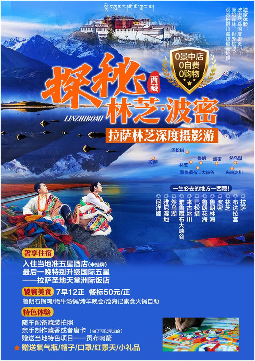 早餐后乘车前往著名的国家5A级景区——【巴松措AAAAA级风景区】巴松措是藏传教宁玛派的圣湖,纯净碧绿的湖水在蓝天白云的映衬之下显得格外的迷人,走过浮桥登上湖心小岛来到观景台,凭栏临风登高揽胜足以让你陶间岛上古老的的错宗寺是主要的游览内容,它建于公元13世纪,是宁玛派的著名寺院。巴松措景区集雪山、湖泊、森林、瀑布牧场、文物古迹、名胜古刹为一体,景色殊异,四时不同,名类野生珍稀植物汇集,实为人间天堂,有“小瑞士”美誉。后乘车前往【尼洋阁】位于西藏林芝八一镇娘乳岗前边,是一座高36.9米高的藏式建筑,传说是当年工布王为西藏本土教苯教的开山祖师辛饶米沃所建的一座传教宫殿,其建筑风格可以称得上是林芝一带建筑的代表作之一。登临阁上,可俯视林芝八一镇全貌,能看到尼洋河上最大的“跨桥”、“娘乳”两块湿地,还可仰望阿布堆珠、比日神山、峈莱山、老虎山、穷布增根等众神山。在此景区可赠送体验当地特色项目——贡布响箭。(赠送项目不用不退)。游览结束后乘车前往林芝八一镇享用晚餐【石锅鸡】。石锅鸡可以说是林芝最有名的美食之一,鸡是当地放养的藏香鸡,石锅是用产自墨脱的皂石制作,价格在千元以上。配料有林芝特产的菌类和药材,慢火炖2小时以上,汤汁香浓醇厚,让人食欲大增,富含矿物质微量元素,对人体非常有益。晚餐结束后入住酒店休息