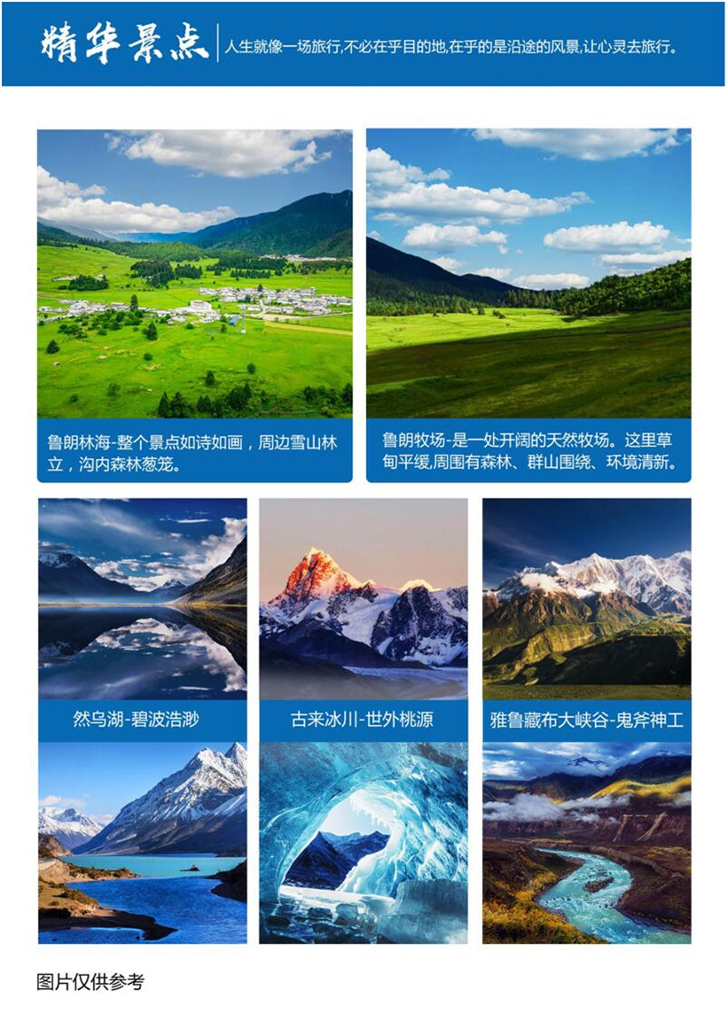 早餐后乘车前往【鲁朗花海、鲁朗牧场】:清晨拍摄鲁朗全景,触摸西藏江南清晨那一抹羞涩的阳光,晒在你的脸上,体验身在花海丛中一点绿。近处朴拙的木牲栏、红白蓝黄的风马旗、开着各色小花的草场上放牧着慵懒的畜群,远处深色的云杉松树林云霭缭绕,更远处雪山上银装素裹,真是一片世外桃源的醉人景象。鲁朗花海千姿百态,争奇斗艳。每年4月份开始,鲁朗花海就变成花的海洋,无数种花在这里竞相怒放、姹紫嫣红、五颜六色,十分对得起“西藏江南”之美誉。午餐后乘车前往波密,随后入住酒店休息