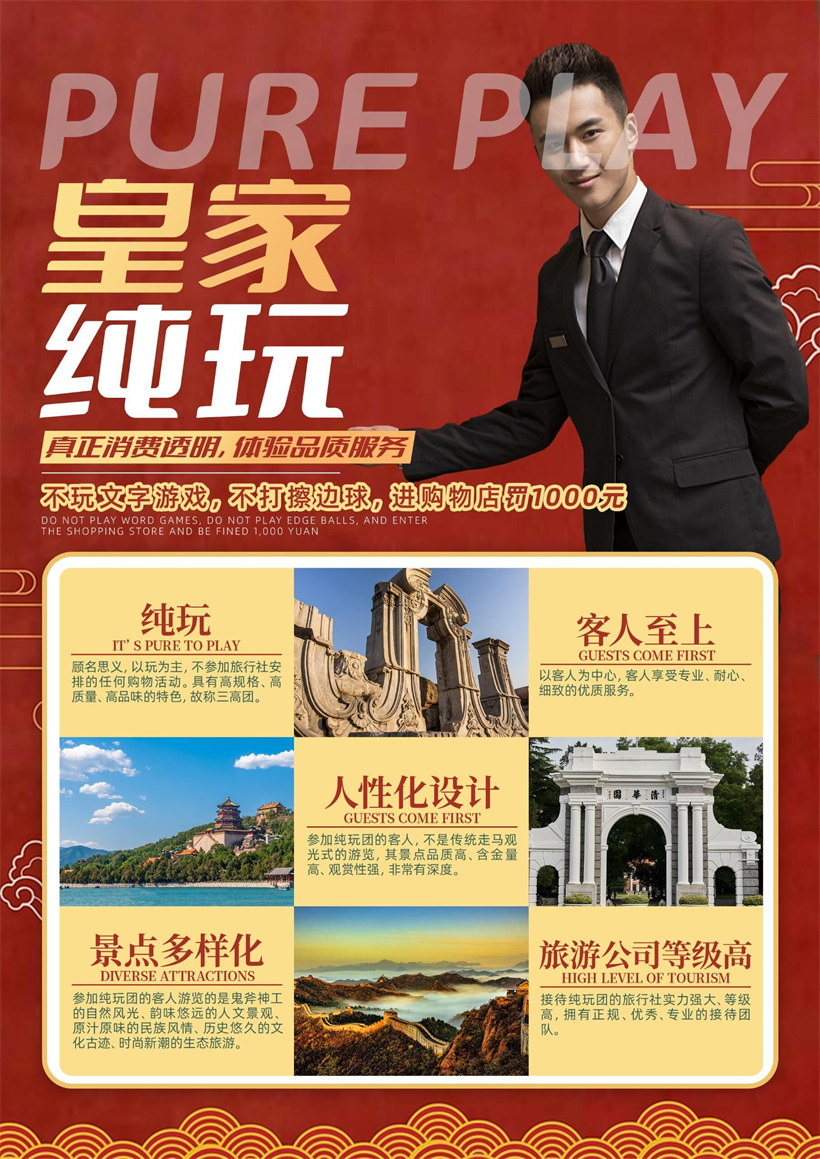①. 北京大多数景区都有销售旅游纪念品的商品部,游客在景区内或自由活动期间的购物行为属于个人行为,请要求商家开具发票或购物凭证以保证您的利益,此类购物与旅行社无关,如需退货旅行社只能协助处理,最终退货与否取决于相应商家,请游客慎重购买。