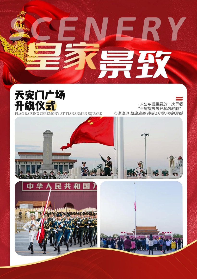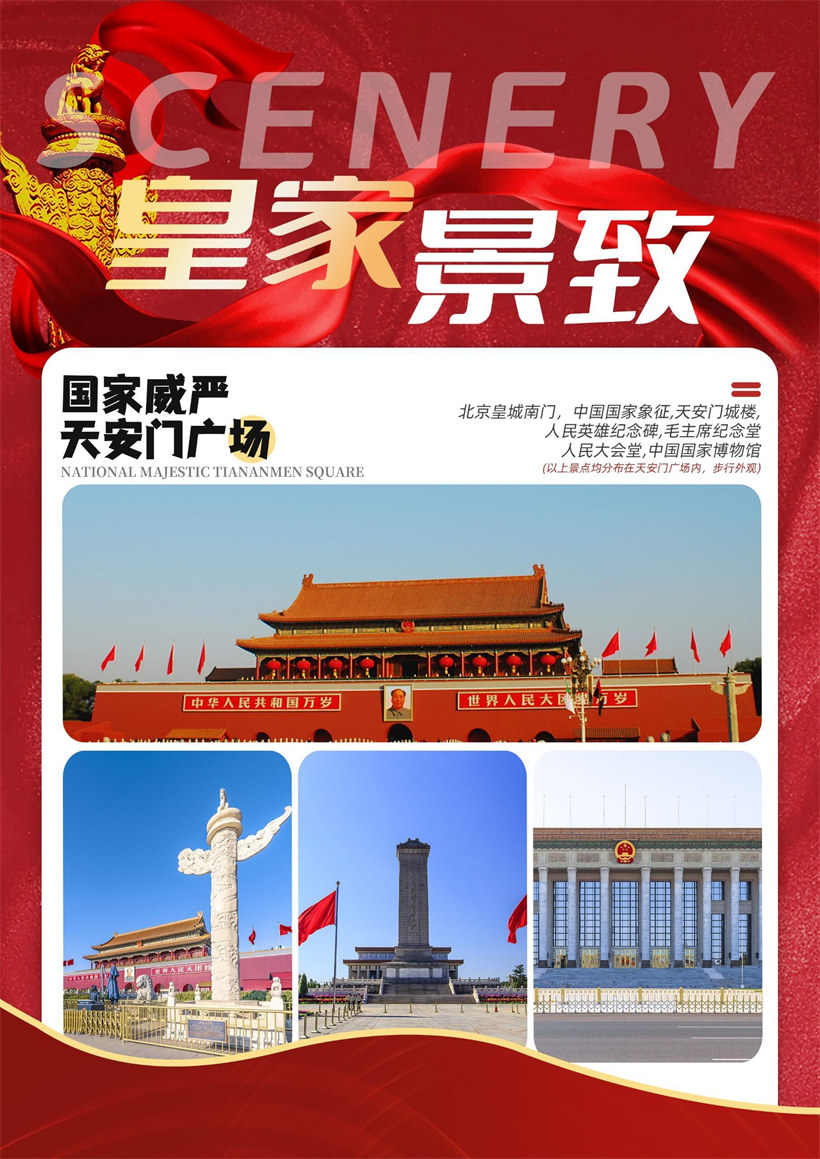 游览景点:天安门广场 参观天安门广场及毛主席纪念堂(如遇政策性关闭或限流,可观外景,不另行安排), 天安门,坐落在中华人民共和国首都北京市的中心,故宫的南端,与天安门广场以及人民英 雄纪念碑、毛主席纪念堂、人民大会堂、中国国家博物馆隔长安街相望,占地面积 4800 平 方米,以介乎的建筑艺术和特殊的政治地位为世人所瞩目。