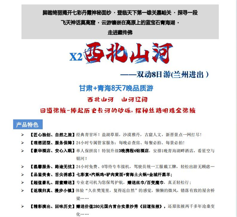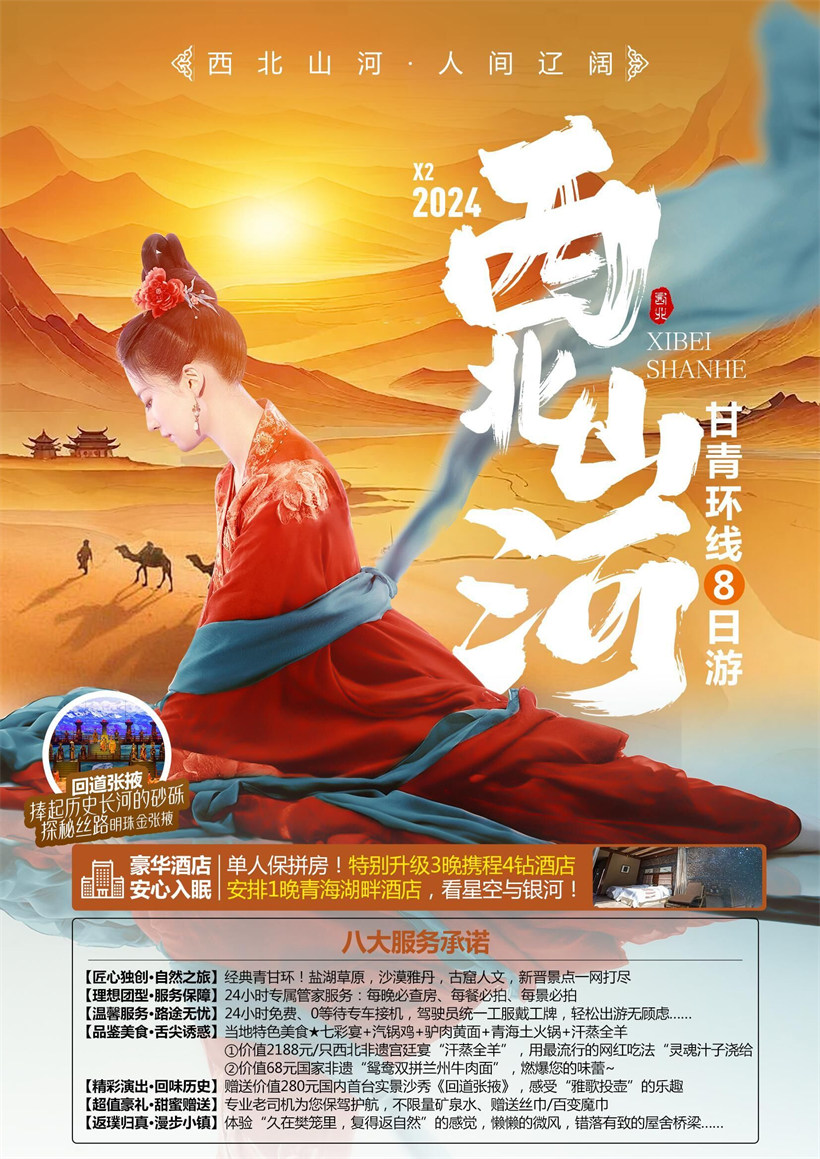 赠送价值280元国内首台实景沙秀《回道张掖》,讲述张掖在汉朝和隋朝时期传奇故事。大汉年间,战 乱不断,渴望和平的西域诸国终于盼来了丝绸之路的开通,共享丝路繁华。霍去病收复河西走廊,牵引出 D3 张掖-敦煌:大地之子、海市蜃楼、鸣沙山月牙泉 早晚 敦煌 D4 敦煌-德令哈:莫高窟、翡翠湖 早中 德令哈 D5 德令哈-青海湖:茶卡壹号盐湖、青海湖 早中晚 青海湖沿线 D6 青海湖-西宁:日月山藏寨、塔尔寺 早中 西宁 D7 西宁-兰州:兰州水车园、黄河母亲雕像、中山桥、黄河书局 早晚 兰州新区 D8 兰州 - 成都 早 温馨的家古邑甘州的繁华市井,络绎不绝的餐馆客栈、跨越千里的罗马商队、异域风情的胡姬酒肆,精彩纷呈!