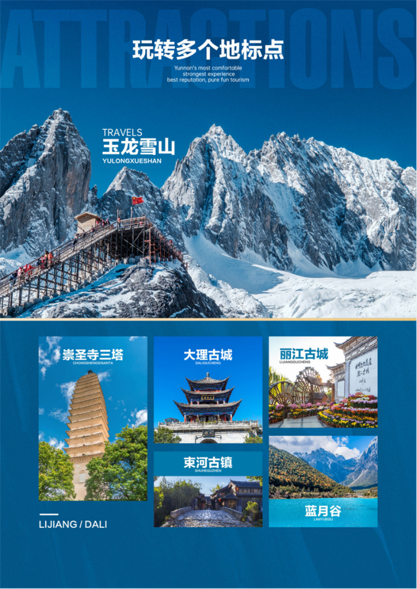 (PS:景点前后顺序会根据当天实际情况以导游安排为准,玉龙雪山冰川公园大索道严卡时间安排,需提前订票,一旦锁定时间无法更改和退还,还请各位游客朋友配合游览安排时间。