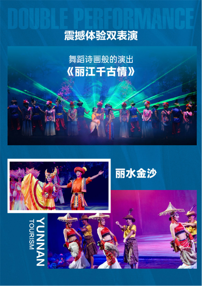 ●赠送《丽水金沙》表演(赠送演出门票280元/人,赠送项目不用不退费)【丽水金沙】通过优美的舞蹈语汇、扣人心弦的音乐曲调、丰富多彩的民族服饰、立体恢弘的舞蹈场面、出神入化的灯光效果,强化、提升了民族歌舞的表现力,对观众具有强烈的艺术冲击力和震撼。