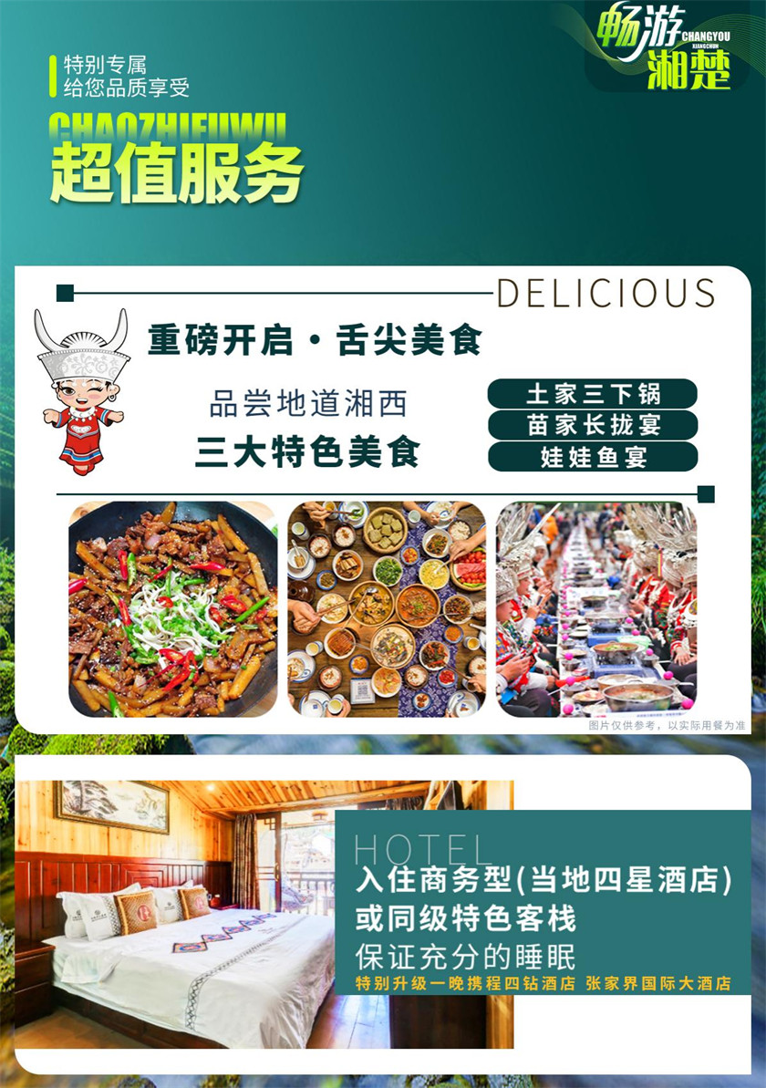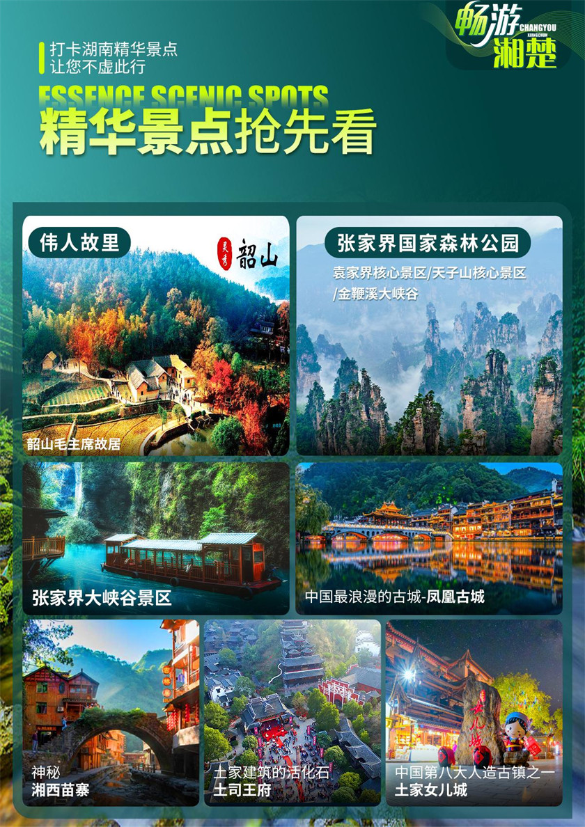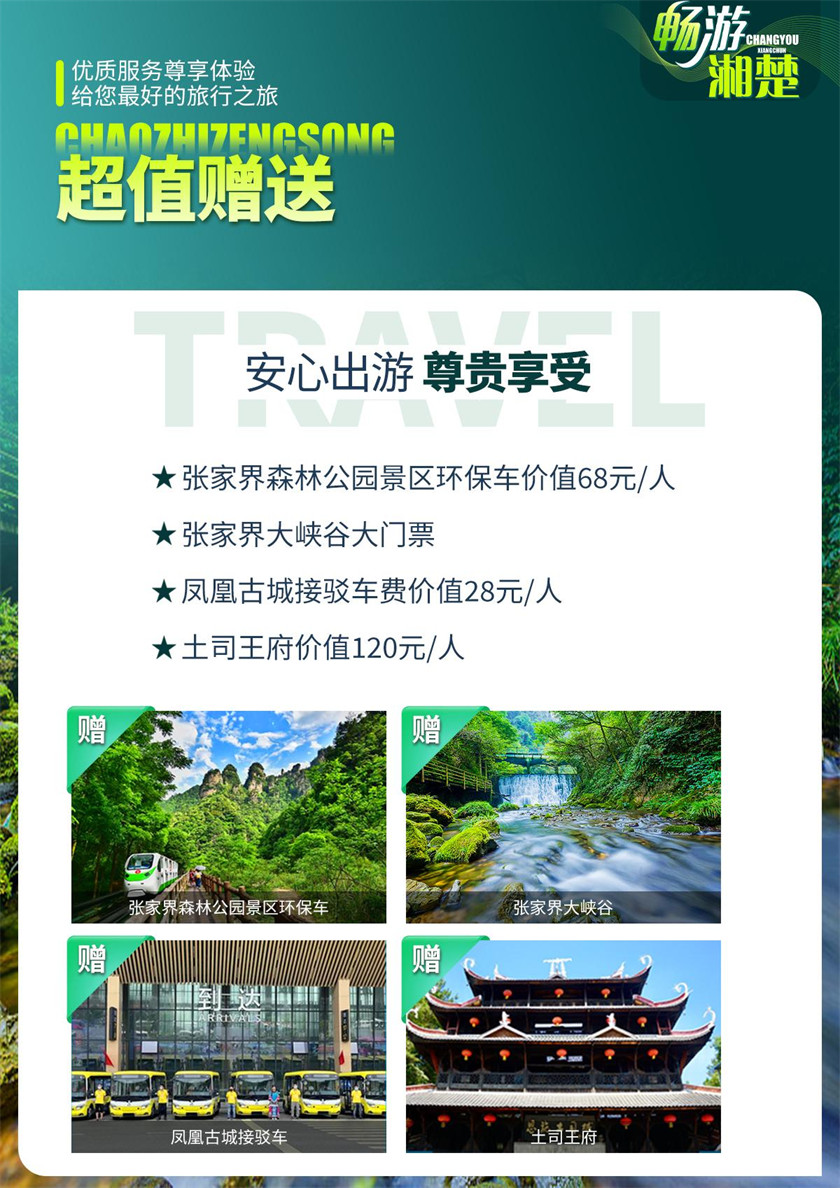 【门票】:首道大门票【张家界国家森林公园(袁家界/天子山/金鞭溪)】赠送:恩施土家女儿城+张家界大峡谷+森林公园景区环保车+韶山环保车+张家界土司城+凤凰古城(含接驳车;不含九景)+湘西苗寨+橘子洲头(可走步行,不含电瓶车费)