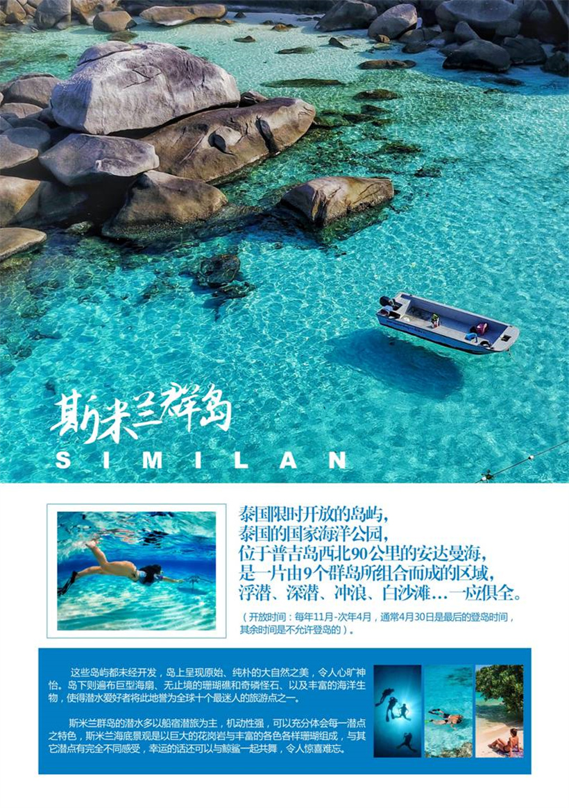 早餐后乘快艇前往【SIMILAN斯米兰群岛】,9个岛中我们挑选了其中最美丽的4个岛分别用整天去完成,让您尽情的游泳浮潜。同时可以有充足的时间在银白色的沙滩上自由活动。斯米兰岛的美丽是无法用言辞来形容的,只有您的亲身体验,才能感受它的独特魅力。首先我们参观其中最美丽的【4号安岛(Koh Miang)】,这里大片坚固的珊瑚礁高度逐渐地降低到大概30-40米,由于海水深度的增加,这个位置被沙子所代替了。在这些岛屿周围形成的旋涡状的、营养丰富的水域有着大量色彩艳丽的热带鱼, 在这些水域观赏到巨大鱼儿的机会是很少的,但是在这你也许会偶然碰到美洲豹鲨鱼,甚至鲸鱼。这里有二十多处合格的潜水点,有许多已发展起来拥有自己的国际声誉。乘快艇往斯米兰群岛的标志性岛屿【8号斯米兰岛(Koh Similan)】,8号斯米兰岛上的象头岩(Elephant Head)可能是这群岛屿中最著名的潜水地带,这里是以伸出海面到斯米兰岛西南角的、形状不规则的岩石而命名的。您可以漫步洁白的沙滩,也可以跟随队伍登上斯米兰群岛的至高点,观赏绝美的海景风光,于岛上享用午餐后,我们继而前往著名的【7号巴布岛koh pabu】,这里的【仙境礁(Fantasy Reef)】, 是适合于勘探大量水下岩石形成的受欢迎的地点,同时在这也能碰到一些活的发光物体。我们可以在这里进行浮潜,一览海底世界丰富的鱼群,及五彩缤纷的珊瑚,之后前往【9号班古岛(Koh Bangru)】上的【圣诞角(Chrismas Point)】,这里是以系列蜿蜒迷人的海湾而得名,多彩成群的蓝鳍鲹,金枪鱼穿梭其中,潜水爱好者您不妨体验畅游其中的乐趣