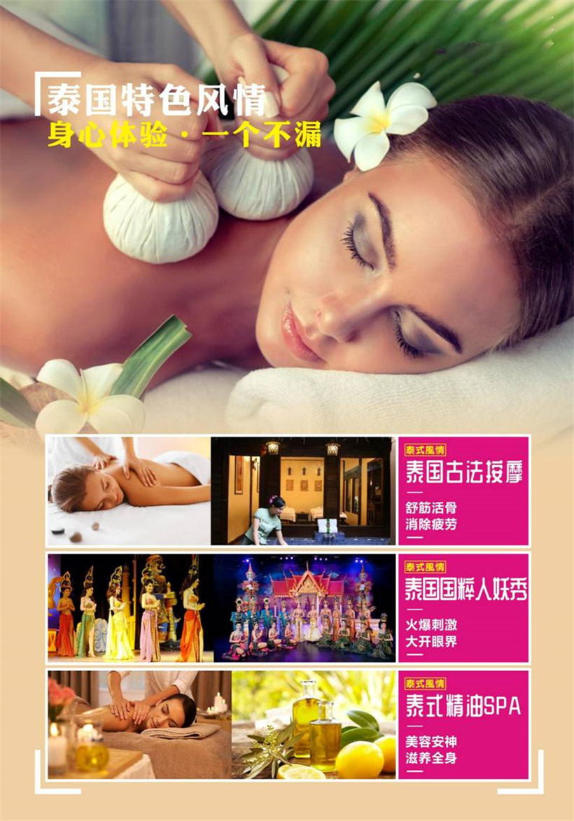 午餐后前往 SPA 馆,享受一次精心安排的 【泰式精油 SPA】给皮肤一次滋润,给心情一次洗礼,缓解旅程的一路疲劳。 (小费需自理约 100 泰铢/人,SPA 不接待 18 岁以下小孩,该项 目为赠送,不退费用,敬请谅解)