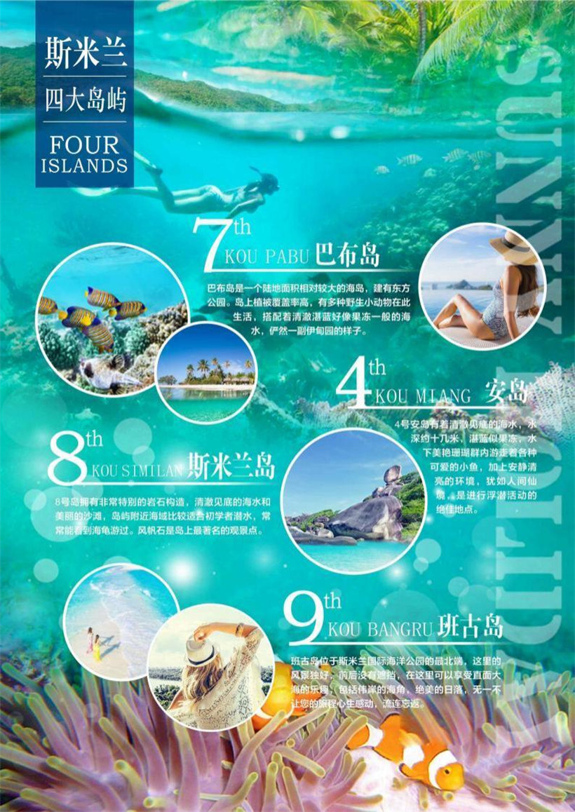 拼车拼船【乘快艇】前往【SIMILAN 斯米兰群岛】 ,9 个岛中我们挑选了其中【最美 丽的 4 个岛】分别用整天去完成 ,让您尽情的游泳与浮潜 。 同时可以有充足的时间在银白色的沙滩上 自由活动。斯米兰岛的美丽是无法用言辞来形容的 ,只有您的亲身体验 ,才能感受它的独特魅力。首 先我们参观其中最美丽的【4 号安岛(Koh Miang)】 (不低于 30 分钟) ,这里大片坚固的珊瑚礁高 度逐渐地降低到大概 30-40 米 , 由于海水深度的增加 ,这个位置被沙子所代替了。在这些岛屿周围形 成的旋涡状的 、 营养丰富的水域有着大量色彩艳丽的热带鱼, 在这些水域观赏到巨大鱼儿的机会是很 少的 ,但是在这你也许会偶然碰到美洲豹鲨鱼 ,甚至鲸鱼。这里有二十多处合格的潜水点 ,有许多已 发展起来拥有自己的国际声誉 。 乘快艇往斯米兰群岛的标志性岛屿【8 号斯米兰岛(Koh Similan)】 (不低于 30 分钟) ,8 号斯米兰岛上的象头岩(Elephant Head)可能是这群岛屿中最著名的潜水地 带 ,这里是以伸出海面到斯米兰岛西南角的、形状不规则的岩石而命名的 。您可以漫步洁白的沙滩 , 也可以跟随队伍登上斯米兰群岛的至高点 ,观赏绝美的海景风光 ,于岛上享用午餐后 ,我们继而前往 著名的【7 号巴布岛 koh pabu】 (不低于 30 分钟) ,这里的【仙境礁(Fantasy Reef)】 ,是适合于 勘探大量水下岩石形成的受欢迎的地点 , 同时在这也能碰到一些活的发光物体。我们可以在这里进行 【浮潜】 ,一览海底世界丰富的鱼群 ,及五彩缤纷的珊瑚 ,之后前往【9 号班古岛( Koh Bangru)】 (不低于 30 分钟)上的【圣诞角( Chrismas Point ) 】 ,这里是以系列蜿蜒迷人的海湾而得名 ,多彩 成群的蓝鳍鲹 ,金枪鱼穿梭其中 ,潜水爱好者您不妨体验畅游其中的乐趣。之后我们将带着愉快的心 情返回酒店休息