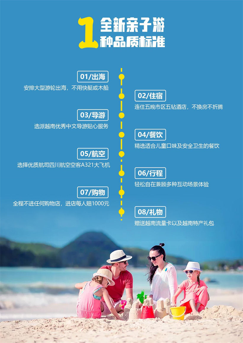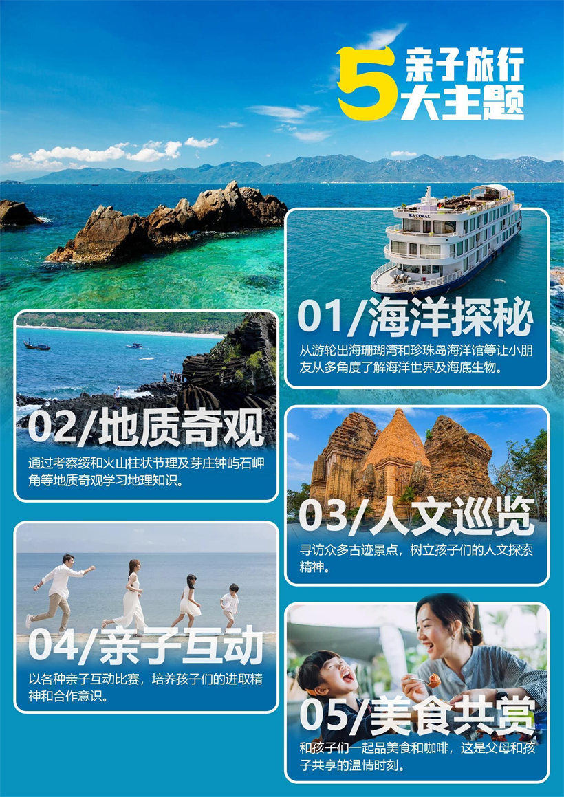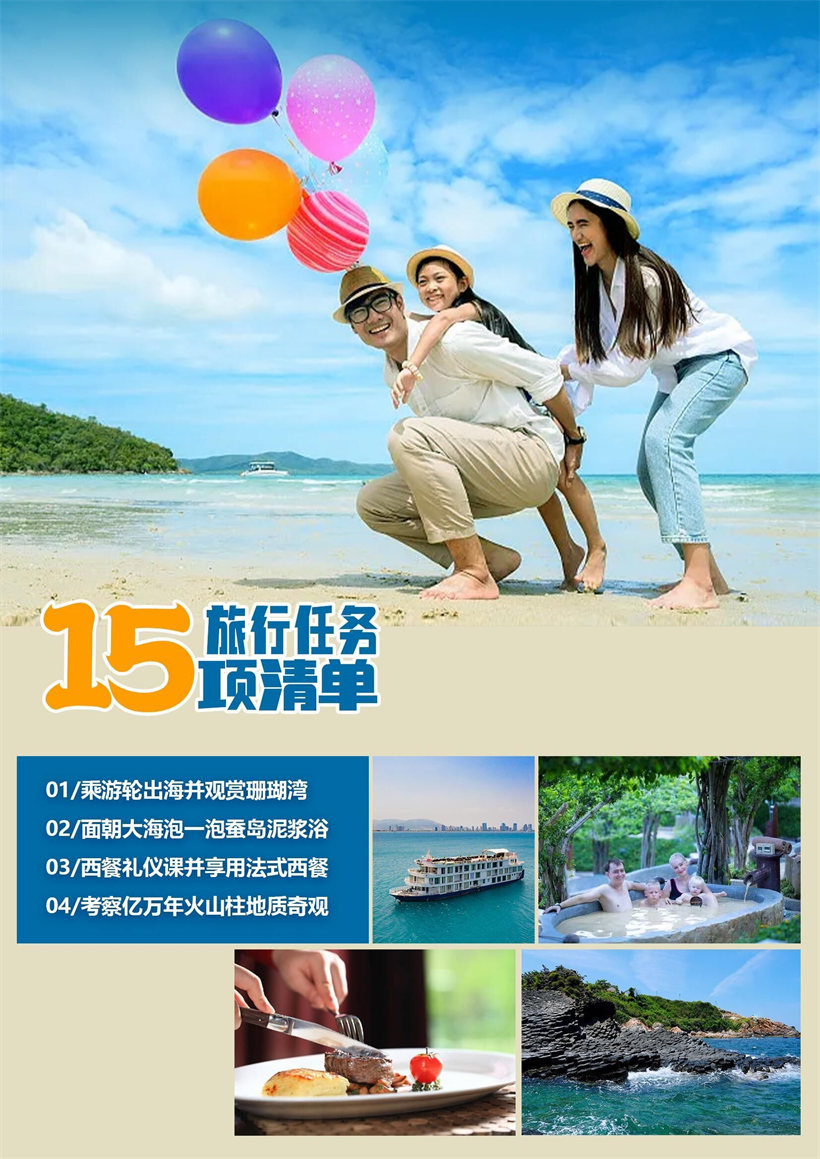 酒店早餐后,导游与司机接您前往码头。乘坐游轮出发,您将在经验丰富的工作人 员的欢迎下登船。当游轮缓缓启动,渐渐驶离码头,芽庄蔚蓝色的大海和无数美丽海岛 尽收眼前,您不仅可以欣赏芽庄湾迷人的美景,还可以随意享用迎宾茶、咖啡和新鲜水 果; 海程的第一站是蚕岛。蚕岛因其原始、清澈的海滩和平静的海浪而受到大自然的青 睐,已成为每位来芽庄的游客必到的景点。岛上可免费体验泥浆浴,在 1350 平方米的 矿泉池中自由放松; 午餐返回船上享用(由专业厨师精心烹制的套餐,满足您的味蕾,包含许多芽庄典 型的海鲜菜肴),学习西餐用餐礼仪,培养小朋友们在日常行动中懂礼知礼;通过西餐 礼仪知识学习后,能够在日后的日常生活中灵活使用所学的礼仪知识,成为更优雅更优 秀的人; 午餐后,您可以在上层甲板区放松身心并享受日光浴,也可参观竹岛的珊瑚湾,这 是当今越南最大的珊瑚和海洋保护区(拥有 350 多种珊瑚和 230 多种鱼类)。您可 以自由游览岛屿并使用项目中包含的服务:在美丽的海滩享受日光浴、体验游泳观赏珊 瑚或划皮艇; 结束后,乘船返回码头(14:00 回港),送回酒店休息后自由活动。