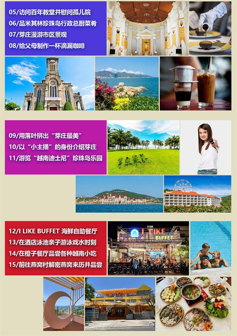 酒店早餐后,导游与司机前往酒店接您,出发前往市区景点 【芽庄大教堂】,建于 1928-1933 年,典型的哥特式建筑,充满法式风情,登上 教堂可俯瞰芽庄街景,繁杂吵嚷的街头,教堂内则静谧平和,俨然另一个世界。 【占婆塔】全称为“婆那加占婆塔”,是印度教的建筑,被誉为“越南的小吴哥窟”, 至今已有 1200 年的历史,在这里身穿鲜艳的衣服,能拍出美美的照片。 【龙山寺】,芽庄最古老的寺庙,寺内的汉字门联、龙纹雕柱等元素都透露着强烈 的中国文化气息,芽庄市区任何地方都能看见的 24 米白色大佛就在这里;在这里可以 俯瞰芽庄全景。 【钟屿石岬角】又称“五指岩/红石角”,这里有多处巨大的花岗岩海角直指南海 之中。这个岬角挨着一处质朴的沙滩海湾,这里没有修脚和按摩的人,但却有海岛风光 和乡土风情。 注:如遇当地政策原因导致芽庄大教堂、龙山寺无法入内参观,则改为车观或外观,敬 请谅解! 午餐后前往体验制作咖啡(包含咖啡/鲜榨果汁、腰果、水果干),芽庄的咖啡文 化在殖民地时期就已经形成。芽庄人爱喝咖啡就像中国人爱喝茶一样,在这里咖啡不是 冲泡的速溶咖啡,也不是用咖啡壶煮,而是要用专门的滴漏咖啡杯。冲泡方式看似简单 易学,里面却有大大的学问哦,大小朋友都可在咖啡师的带领下制作一杯纯正的越南滴 漏咖啡,小朋友可以向父母献上自己亲手制作的咖啡,慢慢地享受属于你们的时光。 活动 1:【最美摄影师】,在上述景区中,用落叶或树枝拼凑出“芽庄最美”四个字, 拍摄一张全家福; 活动 2:【我是小主播】,在上述景区中,拍摄一个关于景区文化知识的短视频,父 母提问,孩子回答;