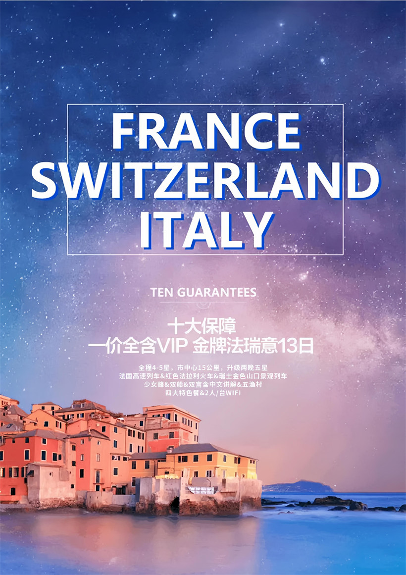 09:00 乘车前往意大利的世外桃源五渔村*(含小火车)。Cinque Terre 又称为“五渔村“,是地中海畔列名于世界文化遗产 中的五座美丽渔村。搭乘当地火车来往于村落之间,欣赏在 悬崖峭壁的 绵延海岸线及山谷有许多色彩缤纷的房舍,斜 坡上绿意盎然的葡萄园,景色宜人,令人心旷神怡。碧澈的 海水和奇巧的险峰让这五个静静躺在利古里亚海边山坳中的小渔村有了 如诗如画的醉人之美。 沉浸于古老的遗迹与壮观的景致在碧绿大海的衬托下,沿线右边 是壮丽陡峭的山崖,左边即是 蔚蓝深邃的利古里亚海,远看彷佛十分惊险,就像走在石壁 之中,让走在小径上的恋人紧紧地 牵起双手,佳人美景更添浓情蜜意。