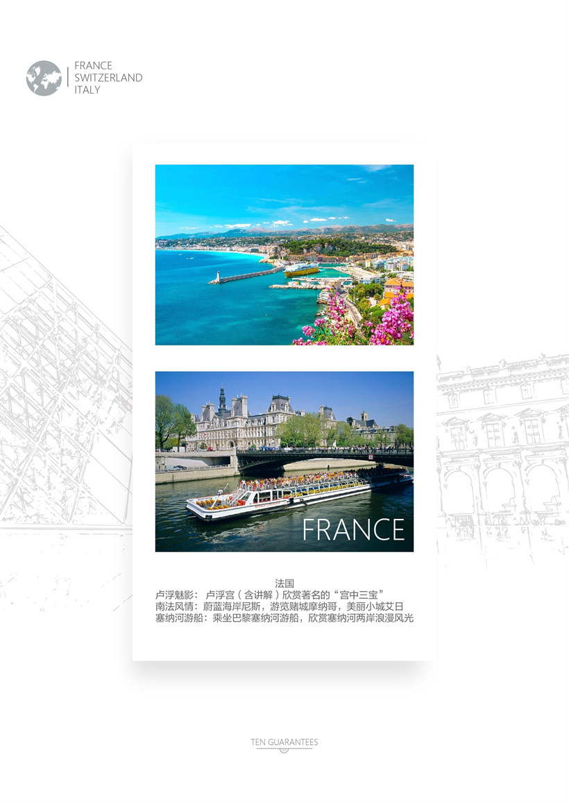 08:30 参观世界三大博物馆之一的卢浮宫*(含门票和专业人工 中文讲解),这个建筑的本身就是艺术杰作,它坐落在塞 纳河中心的北岸,在这座艺术殿堂里您可欣赏到镇馆三 宝:蒙娜丽莎的微笑、维纳斯雕像和胜利女神像。我们为 您安排中文讲解员向您讲述这座艺术宫殿的珍贵收藏。