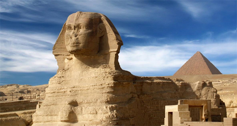◆ 守护金字塔的人面狮身位于次高的卡夫拉金字塔前面的这座人面狮身像,完全是由一整块的岩石雕刻出来的,古埃及人常用狮子代表法老王,结合狮子的力量配合人的智慧,象征古代法老的智慧和权力,这种法老王既是神又是人的观念,促使了狮身人面混合体的产生。