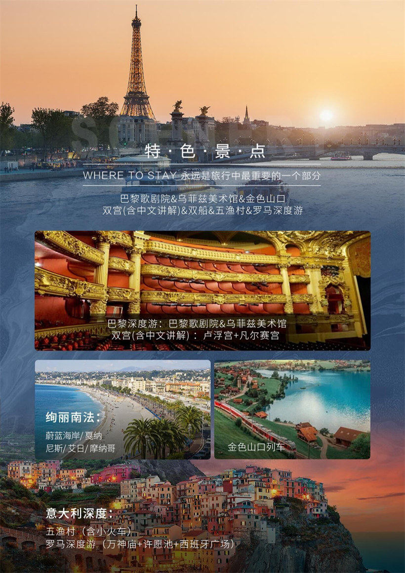 14:30 抵达摩纳哥,参观富丽堂皇的蒙特卡罗大赌场(外观),赌场周围停靠着各式各样世界顶级汽 车令人称羡。流连于地中海边,感受欧洲富豪奢华风情。(下车游览约 1 小时) 15:30 乘车前往意大利小镇。