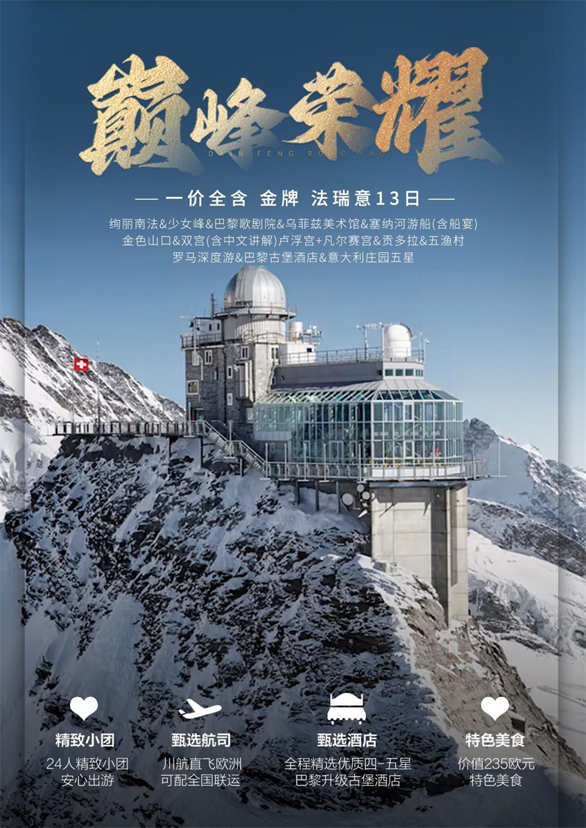 13:00 登上阿尔卑斯山系著名的雪山—欧洲屋脊少女峰*(约4小 时,含上下山),少女峰是阿尔卑斯山脉的皇后,山顶终 年不化的白雪仿佛她纯白的面纱。在这里可以将阿尔卑斯 山山脉中最让人惊心动魄的全景图尽收眼底,一览无余。