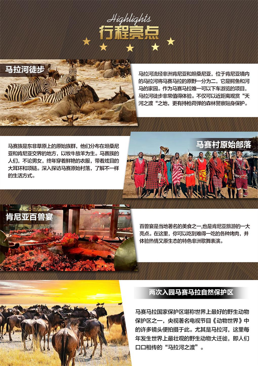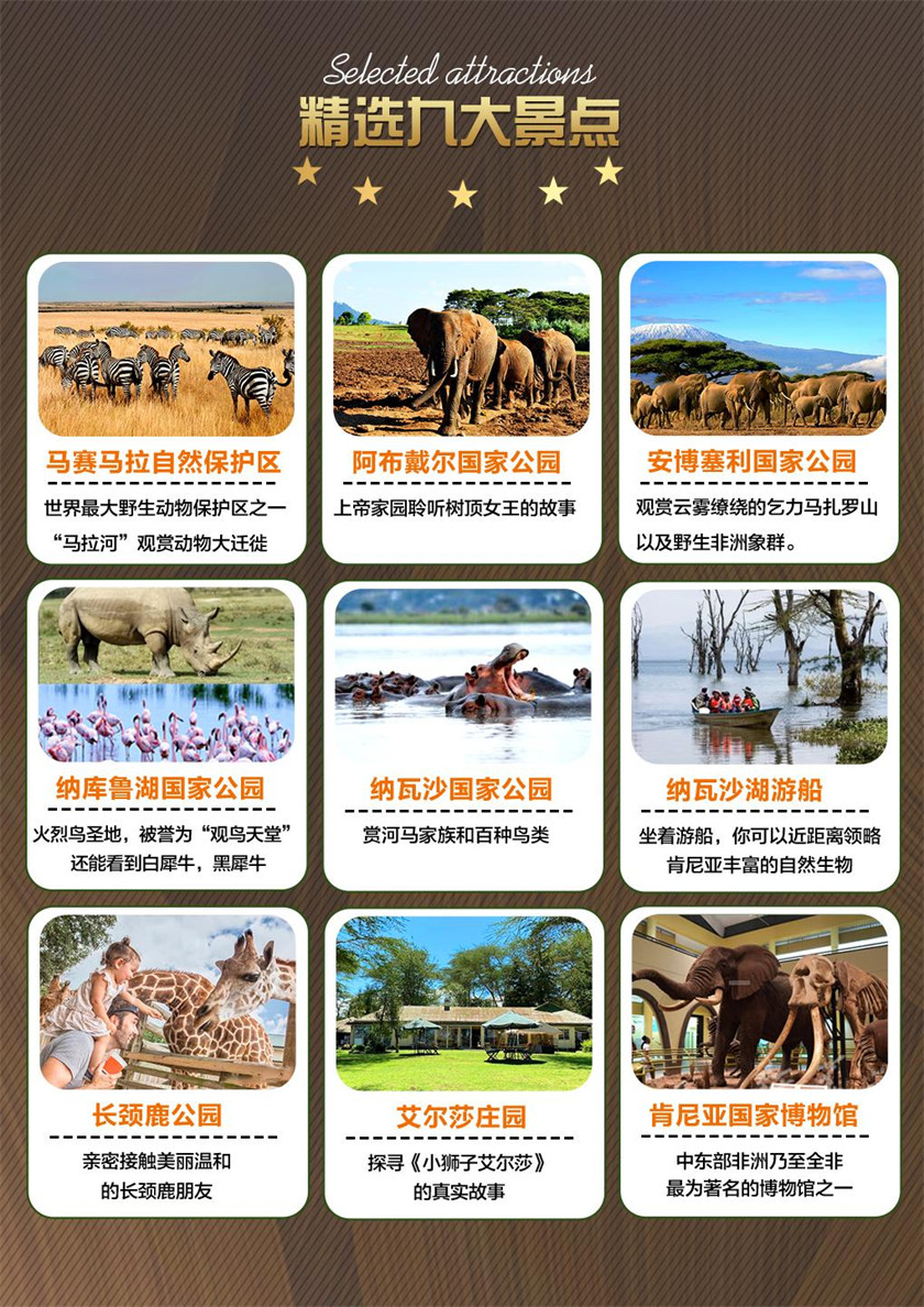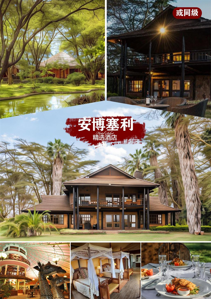 携带早午餐盒入园游览,参观游览安博塞利国家公园(入园游览不低于2小时),眺望远方的山峰和观赏聪明 又可笑的大象,运气好欣赏雪山日出,由于临近云雾缭绕的非洲之巅-乞力马扎罗山,这里的日出格外美好 游览结束后返回内罗毕,晚餐享用特色烤肉百兽宴-safari park 烤肉。 Safari Park酒店是内罗毕的一家五星级酒店,该酒店推出的特色烤肉大餐和非洲歌舞秀成为肯尼亚旅游的必 选项目之一。这里的特色烤肉大餐将为您提供各类精心烤制的美味,以及肯尼亚当地的特色美食,当然也少不 了各式的蔬菜沙拉和新鲜的热带水果。在您品尝美味的同时,也将欣赏肯尼亚著名艺术团Safari Cats给您带来 的热情奔放的非洲歌舞秀