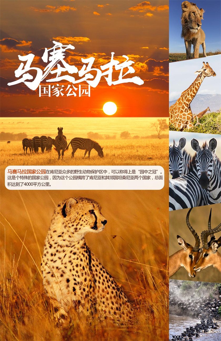 早餐后乘车前往世界上最大的野生动物保护区之一【马赛马拉国家野生动物保护区】(行车约5小时)。马赛 马拉保护区就是每年上演动物大迁徙的地方,被认为是世界上最著名的野生动物保护区。建于 1961 年,是 世界上最大的野生哺乳动物家园。一望无垠的大草原上,散布着成群的羚羊、长颈鹿、斑马等,这里还是狮子的 王国,这些威严、强有力的猎食动物主宰这片草原。马赛马拉国家公园不仅是动物的家园,更是享誉东非的战 士民族-马赛人的家园。 抵达后入住酒店休息,下午可于酒店内自由活动或自费参加当地特色项目。 酒店草坪上特别安排:【日落香槟 SUN DOWNER】体验活动(不低于10分钟),在日落时分,享受着 夕阳西下,静静欣赏着日落,在壮美的落日余晖中微醺沉醉,别有一番风味(赠送项目,导游根据实际情 况具体安排,若有不可抗因素或取消)。 晚上酒店草坪内不定期安排【篝火活动】,当夜幕降临,酒店内的篝火被点燃,有机会体验马赛部落传统 文化,在东非大草原上,抬头仰望星辰,呼吸世上最清新的空气,放下一切,享受当下(赠送项目,酒店 根据实际情况具体安排,若有不可抗因素或取消)。 酒店不定期有下午茶(赠送项目,建议前台自取,否则视为放弃)。