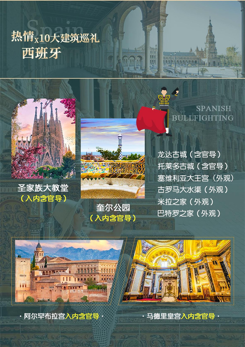 09:00 前往马德里市区城市游览。【★马德里皇宫】(含门票和官导,约 1.5 小时)皇宫建于 1738 年,在曼萨 莱斯河左岸的山岗上,是世界上保存最完整、最精美的宫殿之一。 (温馨提示: 马德里皇宫目前限时限制人数参观,且仍被用于国事活动,当进行国事活动时王宫就会临时 关闭。如当天人数预约已满,我们会根据行程灵活调整参观时间,如遇到国事活动或者其他无法抗拒因素, 我们将退还门票 12 欧,或改为参观《普拉多博物馆》代替原定游览内容,敬请理解。) 【斗牛场(外观)】每年的 3 月 19 日到 10 月 12 日,是马德里的斗牛季节,每周六、日都有斗牛表演, 其中 5 月的圣伊西德罗斗牛节是水平最高、场面也最热闹的。马德里斗牛场位于城市东部,是一座古罗马 剧场式的圆形建筑,外墙为鲜艳的红色,仿佛在呼应斗牛士的红披风。斗牛场可容纳 32000 名观众,在 5 月的高峰时间往往座无虚席。作为西班牙水平最高的斗牛表演场所,全国乃至全世界的斗牛士们都以在马 德里斗牛场表演为荣。前往外观著名球队皇家马德里的主场【圣地亚哥-伯纳乌球场】(约 20 分钟)。【西 班牙广场】它的正中央竖立着文艺复兴时期著名的西班牙文学大师、《堂·吉诃德》作者—塞万提斯的纪 念碑,纪念碑的下面是堂·吉诃德骑着马和仆人桑丘的塑像;游览格兰比亚大街,在它的两侧耸立着至今 还保存完美的中世纪建筑,流露出当时被称为"日不落帝国"的繁荣景象。
