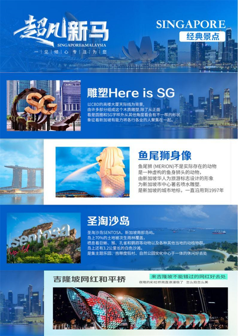 早餐后游览【鱼尾狮公园】(约 30 分钟),您可与新加坡河畔的国家标志物 【鱼尾狮】合照。同时您可以步行至新加坡全新打造的【Here is SG】雕塑前合影 留念。以 CBD 高楼大厦天际线为背景,由许多部分组成了这个木质雕塑,除了 从正面看是圆圈和 SG 字样外,从其他角度看会有不一样的形状,象征着新加 坡有能力将各行各业的人聚集在一起,团结起来,建立一个更大的社区。同时 亦能远观【英国文化风情区】【圣安德烈教堂】【市政厅】【高等法院】【旧国会 大厦】等英国殖民风情建筑群。午餐后驱车前往享有世界文化遗产的【马六甲】, 约在公元 4 世纪阿拉伯人就开辟了从印度洋穿过马六甲海峡,经南海到达中国 的航线。他们把中国的丝绸、瓷器,马鲁古群岛的香料,运往罗马等地。之后 便是著名的郑和下南洋,在这片美丽的土地上留下了无数动人的传说。16 世纪 初,葡萄牙航海家开辟了大西洋至印度洋航线。至十九世纪苏伊士运河贯通, 大大缩短了从欧洲到东方的航路,马六甲海峡的通航船只急剧增多,每年达 10 万多艘,成为世界最繁忙的海峡之一。这里连接世界两大洋,也连接东西方, 被誉为“海上十字路口”,海峡也因沿岸的马六甲古城而得名。马六甲城原是 个小渔村,从 15 世纪中期开始兴旺,建立了满刺加王国,后来统一了马来半岛这便是马来西亚的由来。抵达后洗尽尘嚣,美美的睡上一觉。