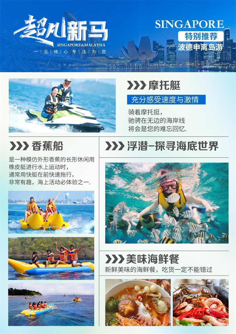 乘机飞往“花园城市”之称的【新加坡】,开启精彩旅程。新加坡---城市 清洁,空气清新,景色优美,享有“花园城市”的美誉。首先前往旅游度假胜 地---【圣淘沙岛】。该岛是斥资 300 多亿人民币打造的亚洲顶级一站式综合娱 乐城和独一无二的家庭度假目的地。【圣淘沙名胜世界】占地 49 公顷,集娱乐、 休闲、住宿、美食、购物于一体,其中大名鼎鼎的【节庆大道】从餐饮、购物 到观赏、娱乐等一应俱全,给您带来无与伦比的全新旅游体验,自由组合享用 美味的新加坡风味,结束后前往酒店办理入住